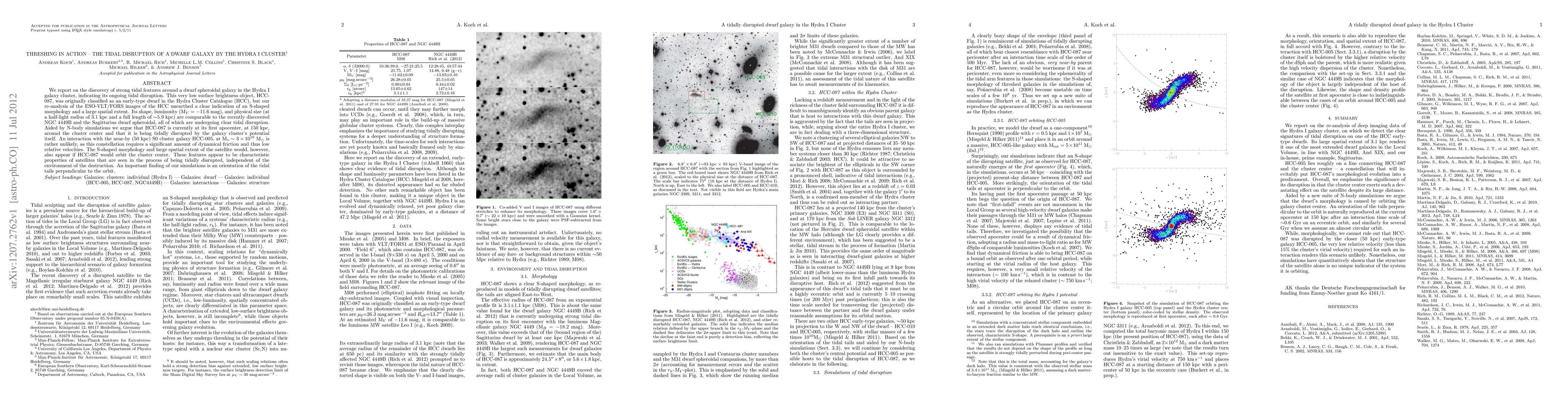 A dwarf galaxy in the Hydra I cluster is being tidally disrupted by the cluster's gravitational pull, exhibiting strong tidal features and an S-shaped morphology. The disruption is characterized by orientation of tidal tails perpendicular to the orbit.