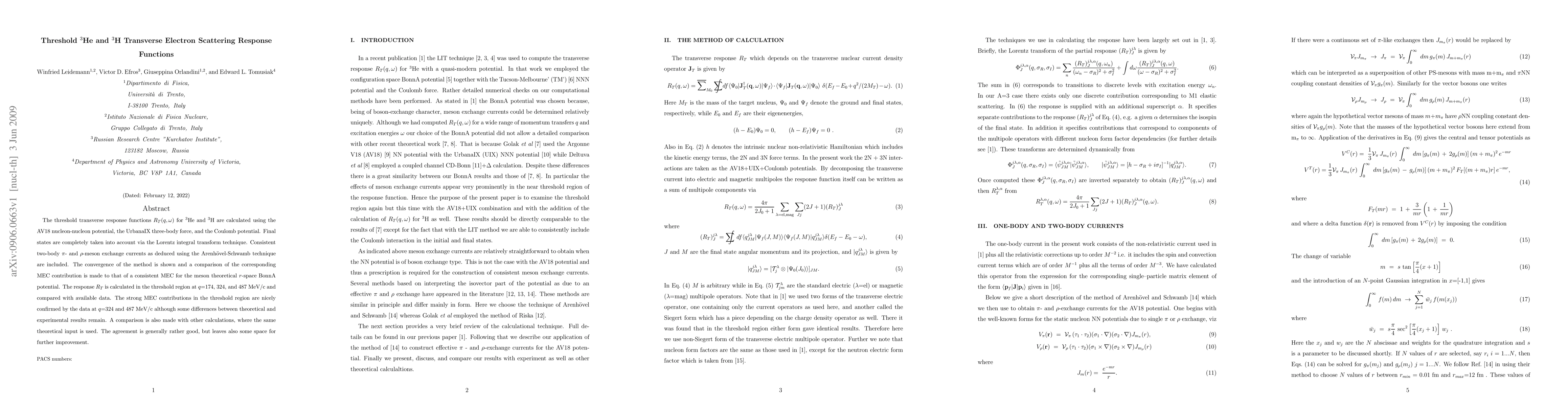 Researchers calculated threshold transverse response functions for 3He and 3H using various nuclear potentials, confirming strong MEC contributions in the threshold region with some discrepancies.