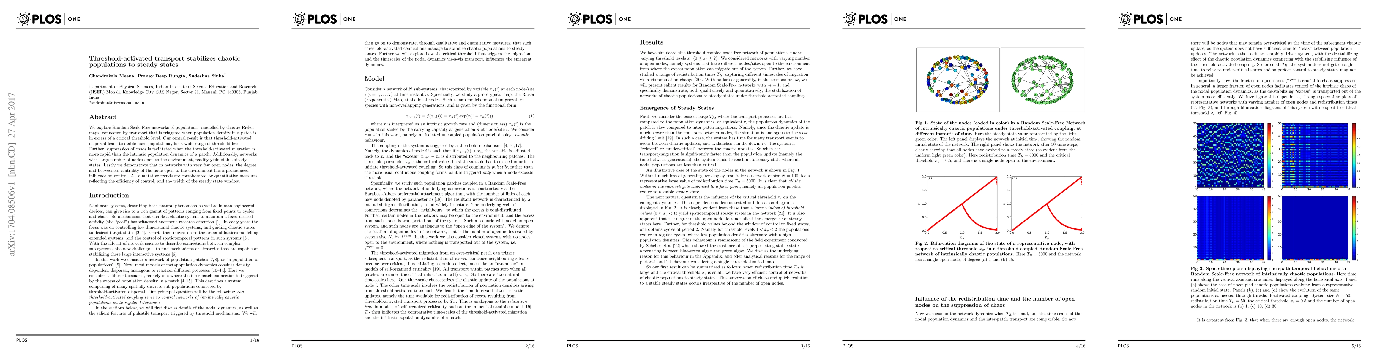 We explore Random Scale-Free networks of populations, modelled by chaotic Ricker maps, connected by transport that is triggered when population density in a patch is in excess of a critical threshold level. Our central result is that threshold-activated dispersal leads to stable fixed populations, for a wide range of threshold levels. Further, suppression of chaos is facilitated when the threshold-activated migration is more rapid than the intrinsic population dynamics of a patch. Additionally, networks with large number of nodes open to the environment, readily yield stable steady states. Lastly we demonstrate that in networks with very few open nodes, the degree and betweeness centrality of the node open to the environment has a pronounced influence on control. All qualitative trends are corroborated by quantitative measures, reflecting the efficiency of control, and the width of the steady state window.