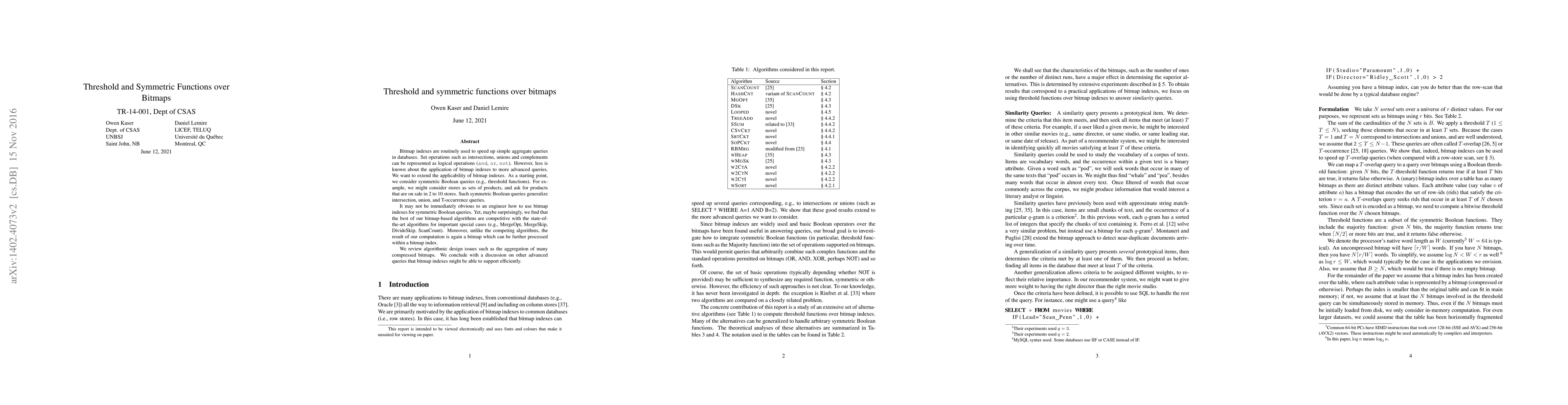 This paper explores the application of bitmap indexes to symmetric Boolean queries, such as threshold functions, to extend their use in advanced database queries. The authors demonstrate that bitmap-based algorithms can be competitive with state-of-the-art methods for specific cases, while maintaining the advantage of producing bitmap outputs that can be further processed within a bitmap index.