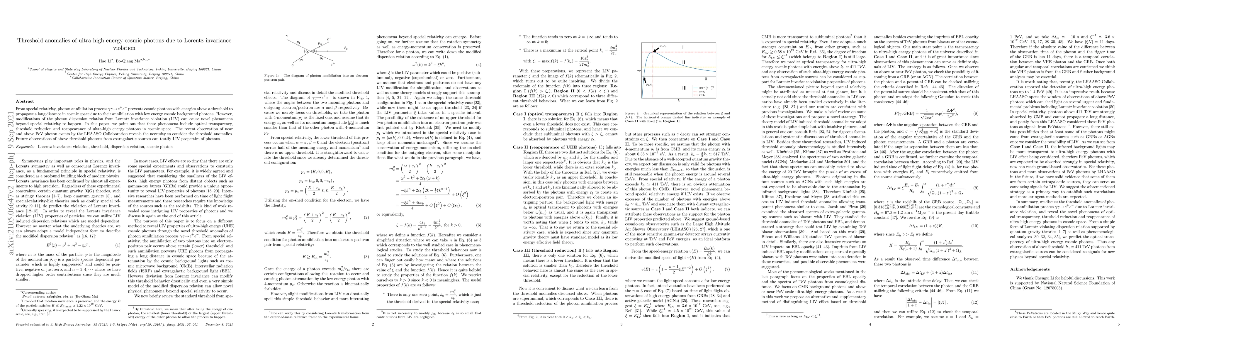 This paper investigates how Lorentz invariance violation (LIV) can modify the photon dispersion relation, leading to optical transparency and the reappearance of ultra-high energy cosmic photons that would otherwise be annihilated. Observations of PeV photons by the LHAASO Collaboration highlight the need to study these threshold anomalies, with future observations potentially confirming LIV properties.