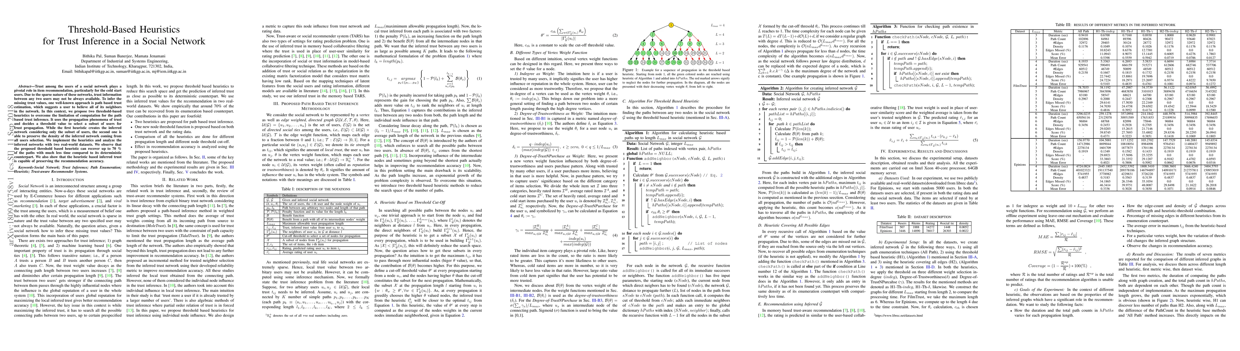 Trust among the users of a social network plays a pivotal role in item recommendation, particularly for the cold start users. Due to the sparse nature of these networks, trust information between any two users may not be always available. To infer the missing trust values, one well-known approach is path based trust estimation, which suggests a user to believe all of its neighbors in the network. In this context, we propose two threshold-based heuristics to overcome the limitation of computation for the path based trust inference. It uses the propagation phenomena of trust and decides a threshold value to select a subset of users for trust propagation. While the first heuristic creates the inferred network considering only the subset of users, the second one is able to preserve the density of the inferred network coming from all users selection. We implement the heuristics and analyze the inferred networks with two real-world datasets. We observe that the proposed threshold based heuristic can recover up to 70 \% of the paths with much less time compared to its deterministic counterpart. We also show that the heuristic based inferred trust is capable of preserving the recommendation accuracy.