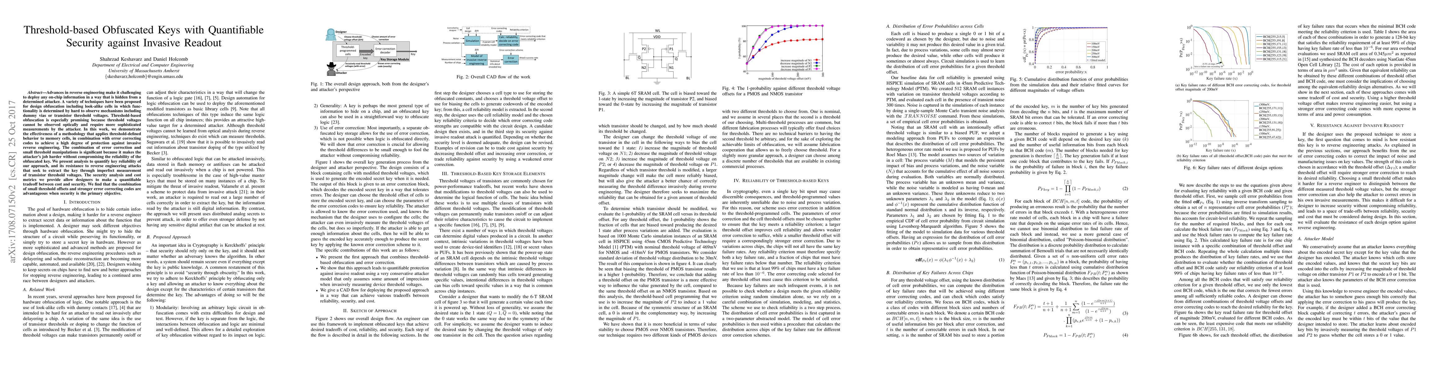 This paper proposes a threshold-based obfuscation technique for on-chip memory cells, combining it with error correcting codes to enhance security against invasive reverse engineering. The method's effectiveness is quantified, showing it significantly complicates key extraction while maintaining key reliability.