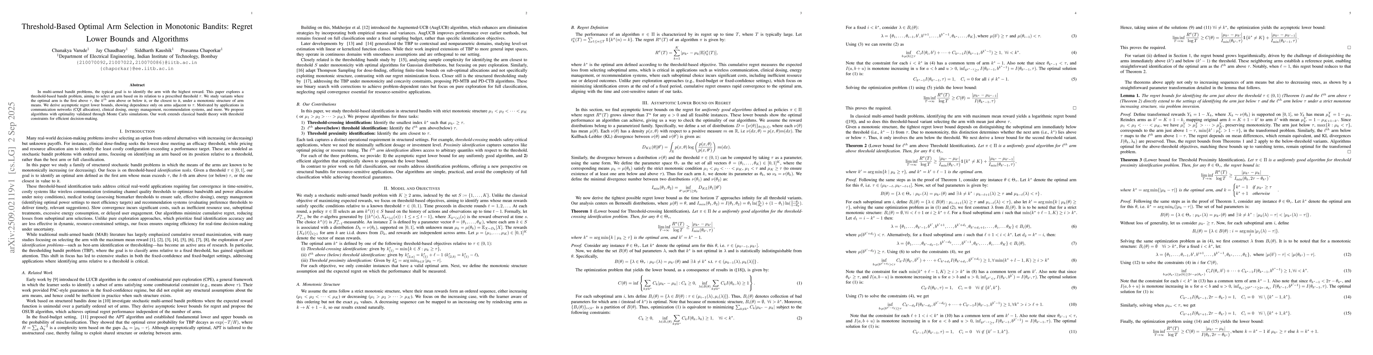 In multi-armed bandit problems, the typical goal is to identify the arm with the highest reward. This paper explores a threshold-based bandit problem, aiming to select an arm based on its relation to a prescribed threshold \(\tau \). We study variants where the optimal arm is the first above \(\tau\), the \(k^{th}\) arm above or below it, or the closest to it, under a monotonic structure of arm means. We derive asymptotic regret lower bounds, showing dependence only on arms adjacent to \(\tau\). Motivated by applications in communication networks (CQI allocation), clinical dosing, energy management, recommendation systems, and more. We propose algorithms with optimality validated through Monte Carlo simulations. Our work extends classical bandit theory with threshold constraints for efficient decision-making.