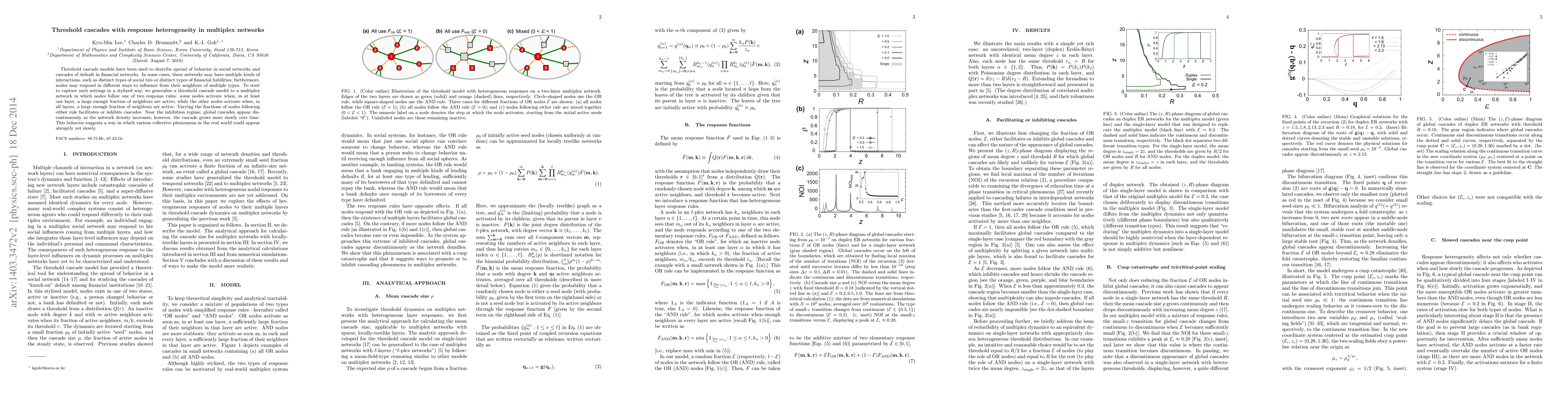Threshold cascade models have been used to describe spread of behavior in social networks and cascades of default in financial networks. In some cases, these networks may have multiple kinds of interactions, such as distinct types of social ties or distinct types of financial liabilities; furthermore, nodes may respond in different ways to in influence from their neighbors of multiple types. To start to capture such settings in a stylized way, we generalize a threshold cascade model to a multiplex network in which nodes follow one of two response rules: some nodes activate when, in at least one layer, a large enough fraction of neighbors are active, while the other nodes activate when, in all layers, a large enough fraction of neighbors are active. Varying the fractions of nodes following either rule facilitates or inhibits cascades. Near the inhibition regime, global cascades appear discontinuously as the network density increases; however, the cascade grows more slowly over time. This behavior suggests a way in which various collective phenomena in the real world could appear abruptly yet slowly.