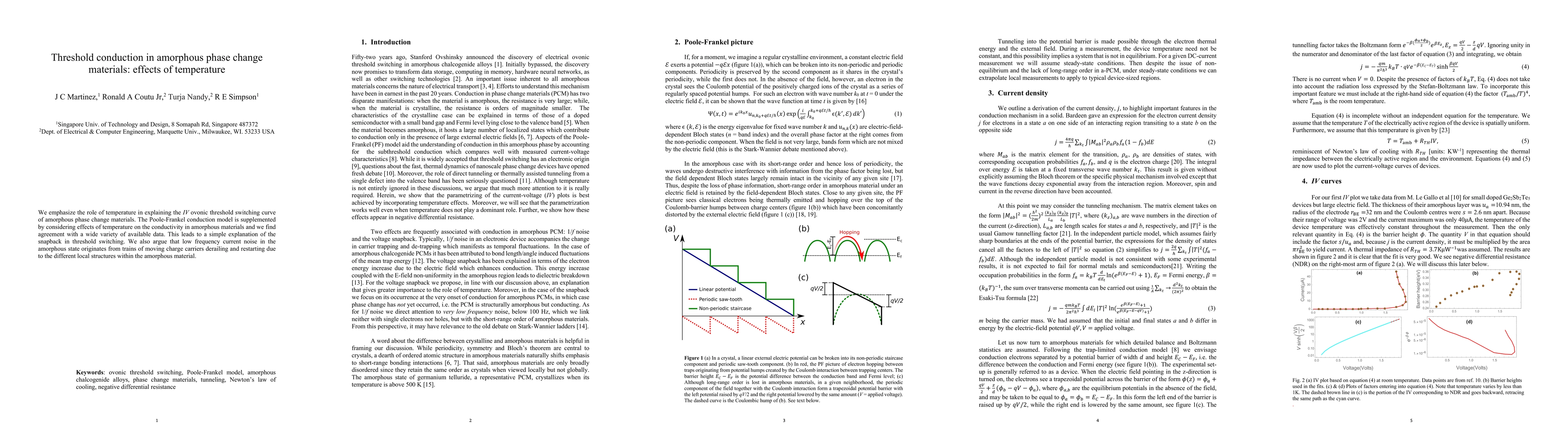 This paper explains the IV ovonic threshold switching in amorphous phase change materials using the Poole-Frankel conduction model, emphasizing temperature effects on conductivity. It provides a simple explanation for the snapback phenomenon in threshold switching and links low-frequency current noise to the movement of charge carriers within the amorphous material's varying local structures.