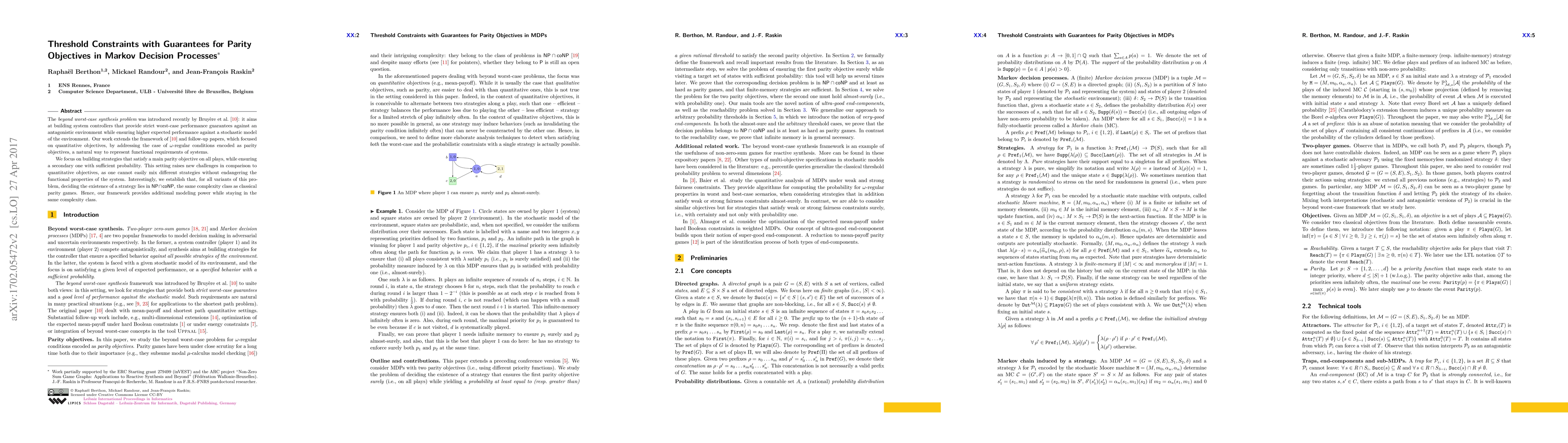 This paper extends the beyond worst-case synthesis framework to address parity objectives in Markov Decision Processes, ensuring strict worst-case performance guarantees while achieving higher expected performance. The authors establish that solving this problem lies in NP ∩ coNP, maintaining complexity equivalence to classical parity games.