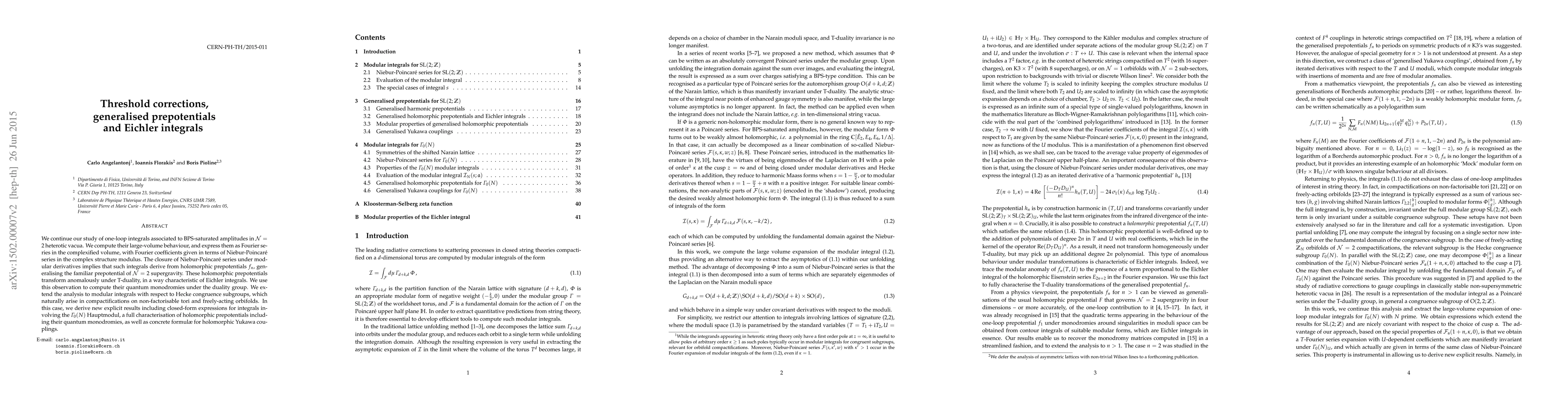 We continue our study of one-loop integrals associated to BPS-saturated amplitudes in $\mathcal{N}=2$ heterotic vacua. We compute their large-volume behaviour, and express them as Fourier series in the complexified volume, with Fourier coefficients given in terms of Niebur-Poincar\'e series in the complex structure modulus. The closure of Niebur-Poincar\'e series under modular derivatives implies that such integrals derive from holomorphic prepotentials $f_n$, generalising the familiar prepotential of $\mathcal{N}=2$ supergravity. These holomorphic prepotentials transform anomalously under T-duality, in a way characteristic of Eichler integrals. We use this observation to compute their quantum monodromies under the duality group. We extend the analysis to modular integrals with respect to Hecke congruence subgroups, which naturally arise in compactifications on non-factorisable tori and freely-acting orbifolds. In this case, we derive new explicit results including closed-form expressions for integrals involving the ${\varGamma}_0(N)$ Hauptmodul, a full characterisation of holomorphic prepotentials including their quantum monodromies, as well as concrete formulae for holomorphic Yukawa couplings.