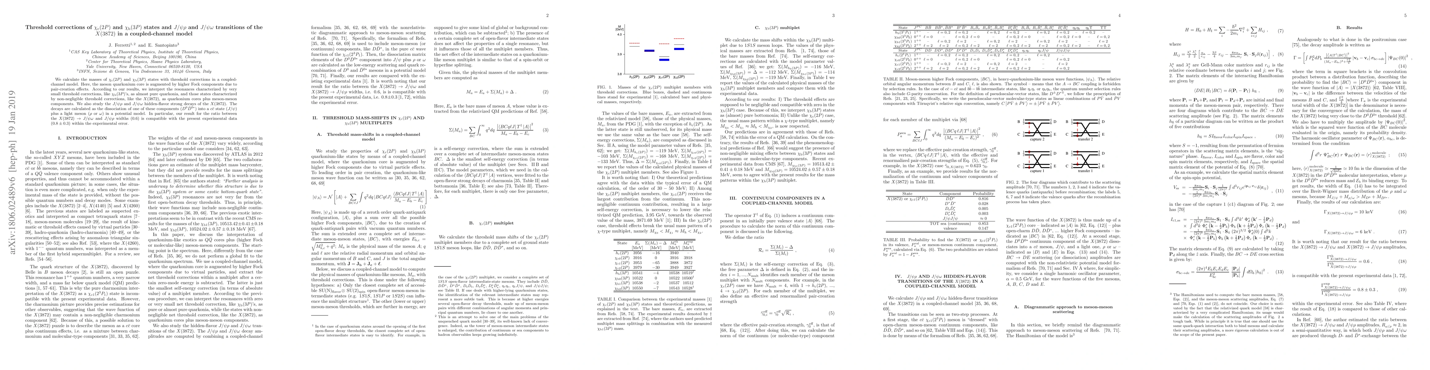 We calculate the masses of $\chi_{\rm c}(2P)$ and $\chi_{\rm b}(3P)$ states with threshold corrections in a coupled-channel model. Here, the meson quarkonium core is augmented by higher Fock components due to pair-creation effects. According to our results, we interpret the resonances characterized by very small threshold corrections, like $\chi_{\rm b}(3P)$'s, as almost pure quarkonia, and those states characterized by non-negligible threshold corrections, like the $X(3872)$, as quarkonium cores plus meson-meson components. We also study the $J/\psi \rho$ and $J/\psi \omega$ hidden-flavor strong decays of the $X(3872)$. The decays are calculated as the dissociation of one of these components ($D^0 \bar D^{0*}$) into a $c \bar c$ state ($J/\psi$) plus a light meson ($\rho$ or $\omega$) in a potential model. In particular, our result for the ratio between the $X(3872) \rightarrow J/\psi \omega$ and $J/\psi \rho$ widths (0.6) is compatible with the present experimental data ($0.8\pm0.3$) within the experimental error.