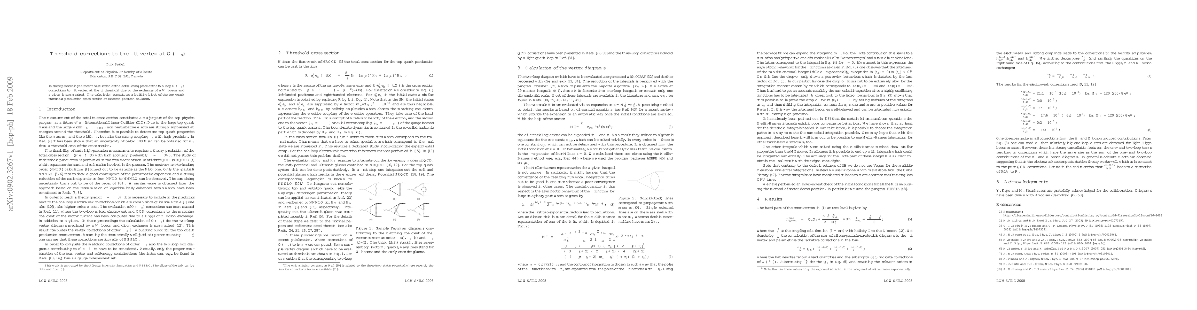 In these proceedings a recent calculation of the last missing piece of the two-loop O(alpha alpha(s)) corrections to gamma t anti-t vertex at the t anti-t threshold due to the exchange of a W boson and a gluon is summarised. The calculation constitutes a building block of the top quark threshold production cross section at electron positron colliders.