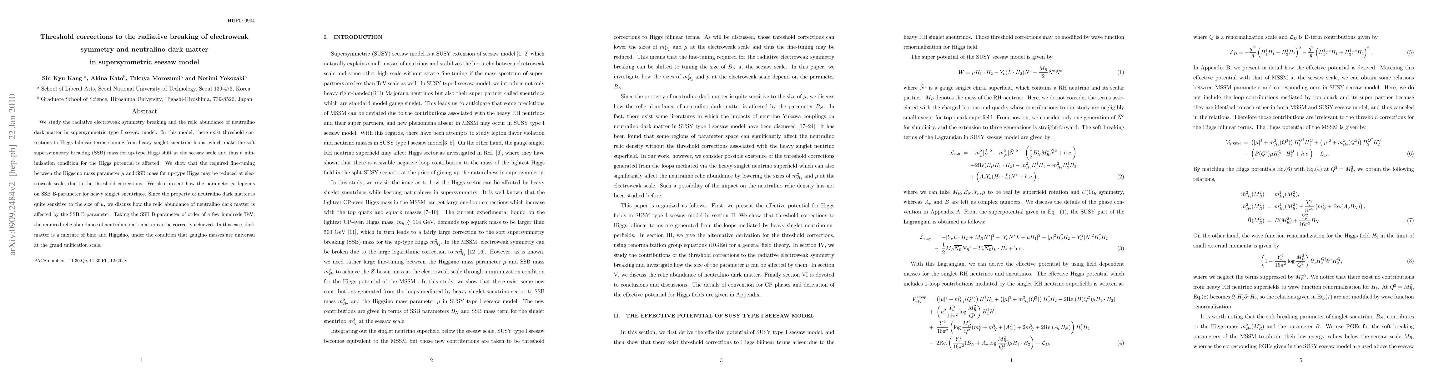 This paper explores radiative electroweak symmetry breaking and neutralino dark matter in the supersymmetric type I seesaw model, highlighting how threshold corrections from heavy singlet sneutrinos reduce fine-tuning between Higgsino mass and up-type Higgs SSB mass. It also examines how the relic abundance of neutralino dark matter is influenced by the SSB B-parameter, achieving the required abundance with a mixture of bino and Higgsino dark matter.
