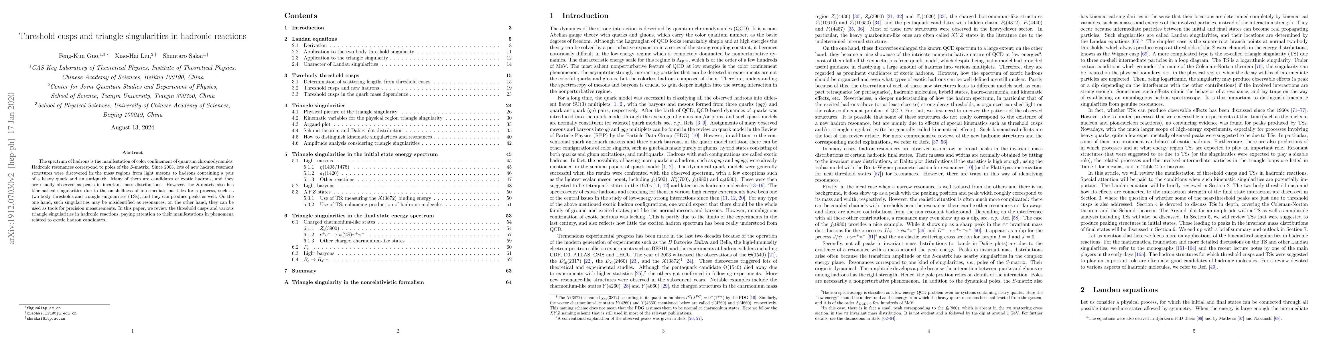 The spectrum of hadrons is the manifestation of color confinement of quantum chromodynamics. Hadronic resonances correspond to poles of the S-matrix. Since 2003, lots of new hadron resonant structures were discovered in the mass regions from light mesons to hadrons containing a pair of a heavy quark and an antiquark. Many of them are candidates of exotic hadrons, and they are usually observed as peaks in invariant mass distributions. However, the S-matrix also has kinematical singularities due to the on-shellness of intermediate particles for a process, such as two-body thresholds and triangle singularities, and they can produce peaks as well. On the one hand, such singularities may be misidentified as resonances; on the other hand, they can be used as tools for precision measurements. In this paper, we review the threshold cusps and various triangle singularities in hadronic reactions, paying attention to their manifestations in phenomena related to exotic hadron candidates.