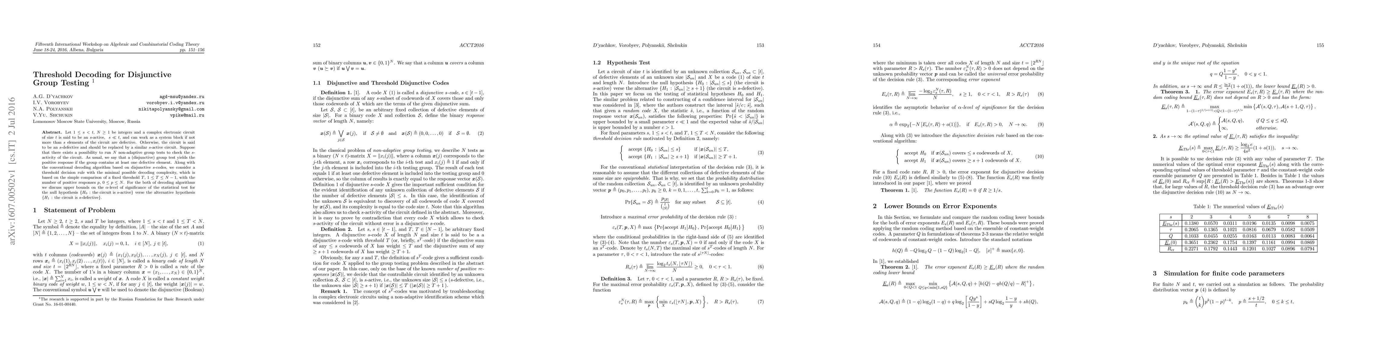 Let $1 \le s < t$, $N \ge 1$ be integers and a complex electronic circuit of size $t$ is said to be an $s$-active, $\; s \ll t$, and can work as a system block if not more than $s$ elements of the circuit are defective. Otherwise, the circuit is said to be an $s$-defective and should be replaced by a similar $s$-active circuit. Suppose that there exists a possibility to run $N$ non-adaptive group tests to check the $s$-activity of the circuit. As usual, we say that a (disjunctive) group test yields the positive response if the group contains at least one defective element. Along with the conventional decoding algorithm based on disjunctive $s$-codes, we consider a threshold decision rule with the minimal possible decoding complexity, which is based on the simple comparison of a fixed threshold $T$, $1 \le T \le N - 1$, with the number of positive responses $p$, $0 \le p \le N$. For the both of decoding algorithms we discuss upper bounds on the $\alpha$-level of significance of the statistical test for the null hypothesis $\left\{ H_0 \,:\, \text{the circuit is $s$-active} \right\}$ verse the alternative hypothesis $\left\{ H_1 \,:\, \text{the circuit is $s$-defective} \right\}$.