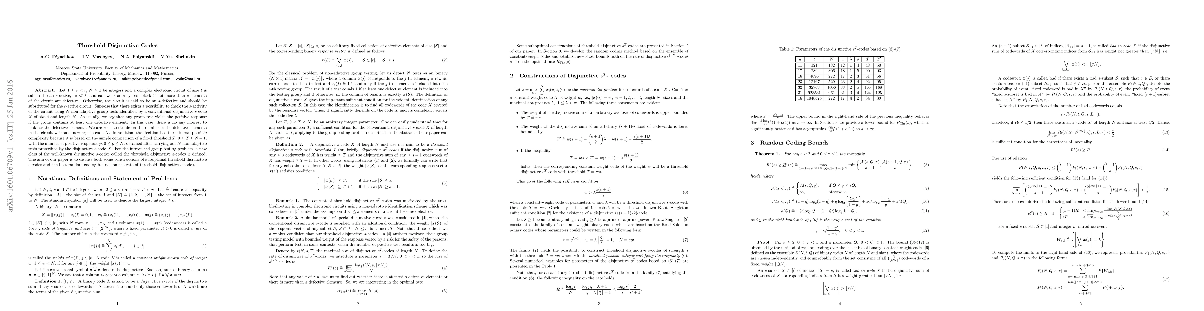 Researchers introduced threshold disjunctive codes for complex electronic circuits, enabling efficient detection of defective elements with minimal complexity. They also explored optimal bounds on the code's rate for effective decision-making.