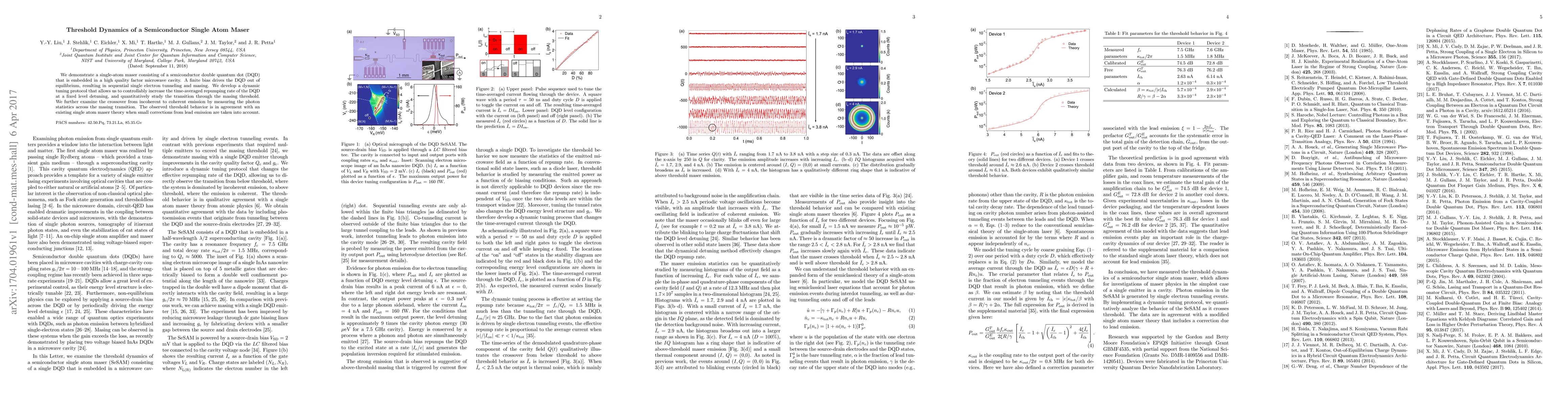 This paper investigates a semiconductor single atom maser using a double quantum dot in a microwave cavity, demonstrating the transition from incoherent to coherent photon emission as the system crosses the masing threshold. The study employs a dynamic tuning protocol to control the repumping rate and validates theoretical predictions with experimental observations.