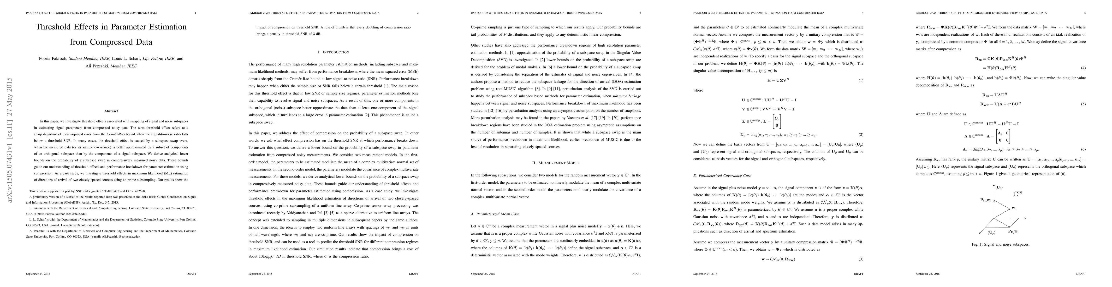 In this paper, we investigate threshold effects associated with swapping of signal and noise subspaces in estimating signal parameters from compressed noisy data. The term threshold effect refers to a sharp departure of mean-squared error from the Cramer-Rao bound when the signal-to-noise ratio falls below a threshold SNR. In many cases, the threshold effect is caused by a subspace swap event, when the measured data (or its sample covariance) is better approximated by a subset of components of an orthogonal subspace than by the components of a signal subspace. We derive analytical lower bounds on the probability of a subspace swap in compressively measured noisy data. These bounds guide our understanding of threshold effects and performance breakdown for parameter estimation using compression. As a case study, we investigate threshold effects in maximum likelihood (ML) estimation of directions of arrival of two closely-spaced sources using co-prime subsampling. Our results show the impact of compression on threshold SNR. A rule of thumb is that every doubling of compression ratio brings a penalty in threshold SNR of 3 dB.