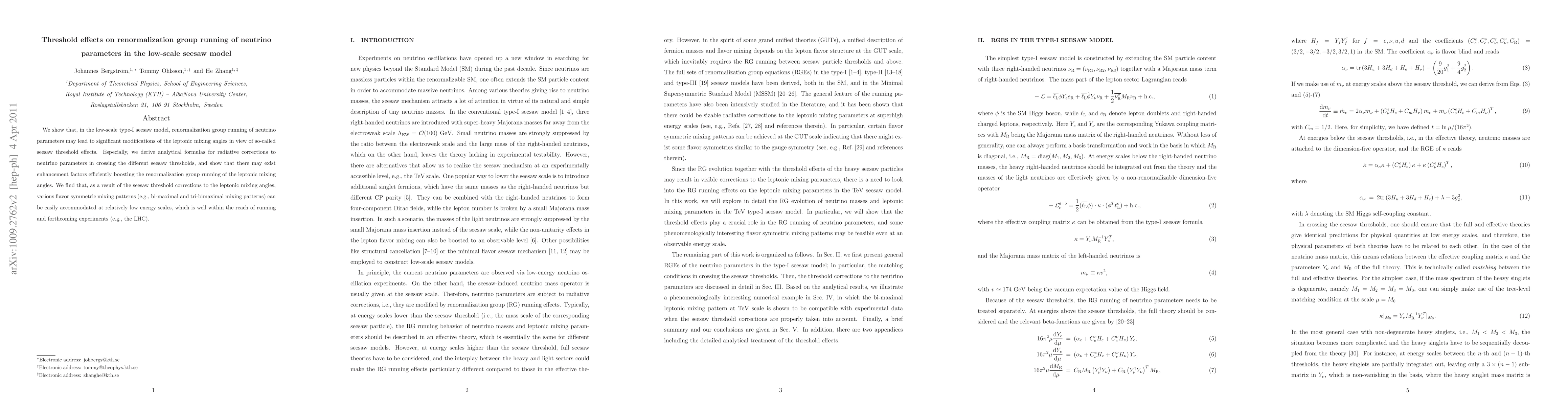 This paper investigates the impact of seesaw threshold effects on the renormalization group running of neutrino parameters in the low-scale type-I seesaw model, deriving analytical formulas for radiative corrections. It finds that these effects can significantly modify leptonic mixing angles, potentially accommodating various flavor symmetric mixing patterns at accessible energy scales.