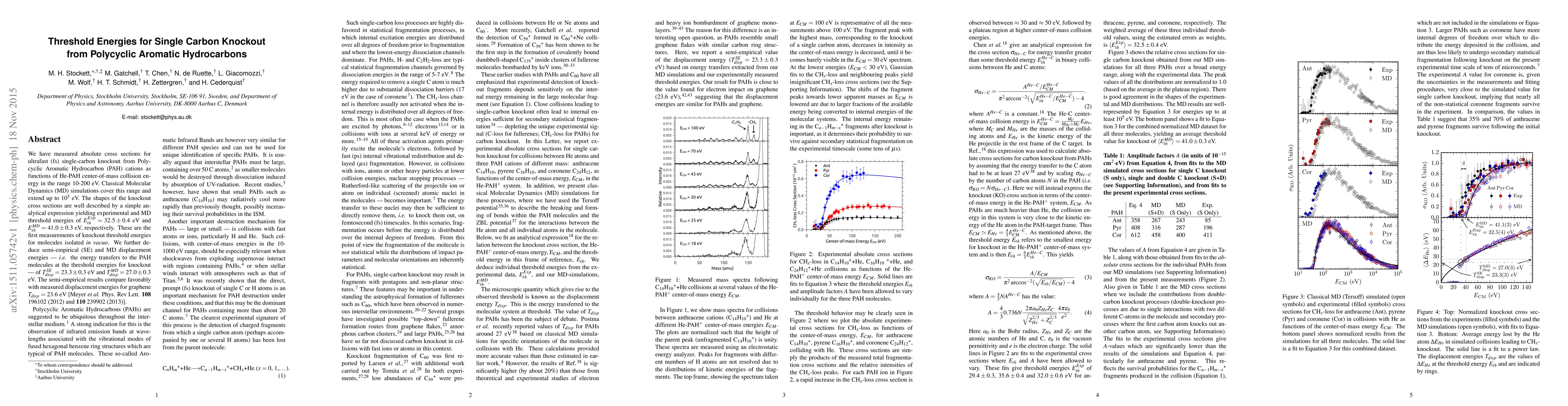 We have measured absolute cross sections for ultrafast (fs) single-carbon knockout from Polycyclic Aromatic Hydrocarbon (PAH) cations as functions of He-PAH center-of-mass collision energy in the range 10-200 eV. Classical Molecular Dynamics (MD) simulations cover this range and extend up to 10$^5$ eV. The shapes of the knockout cross sections are well described by a simple analytical expression yielding experimental and MD threshold energies of $E_{th}^{Exp}=32.5\pm 0.4$ eV and $E_{th}^{MD}=41.0\pm 0.3$ eV, respectively. These are the first measurements of knockout threshold energies for molecules isolated \emph{in vacuo}. We further deduce semi-empirical (SE) and MD displacement energies --- \emph{i.e.} the energy transfers to the PAH molecules at the threshold energies for knockout --- of $T_{disp}^{SE}=23.3\pm 0.3$ eV and $T_{disp}^{MD}=27.0\pm 0.3$ eV. The semi-empirical results compare favorably with measured displacement energies for graphene $T_{disp}=23.6$ eV [Meyer \emph{et al.} Phys. Rev Lett. \textbf{108} 196102 (2012) and \textbf{110} 239902 (2013)].