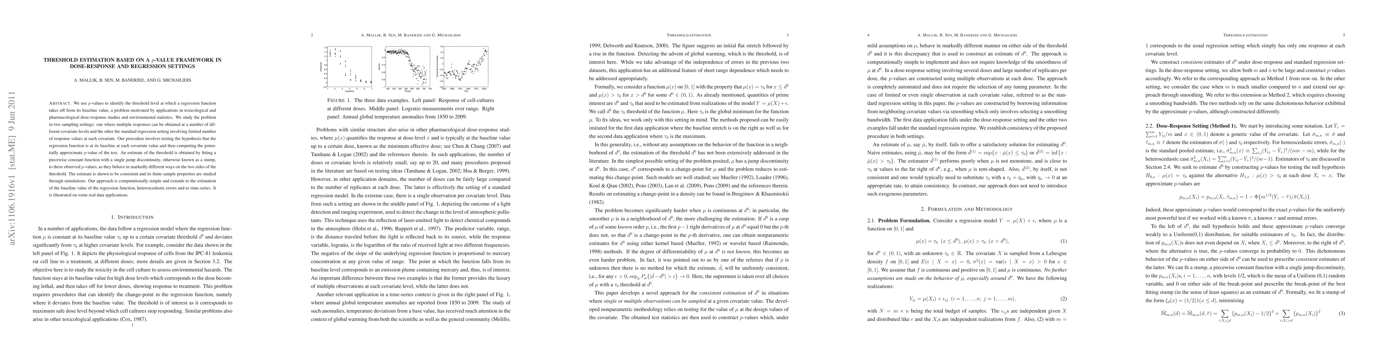 This paper proposes a method to estimate threshold levels in dose-response and regression settings using p-values, identifying where a regression function significantly deviates from its baseline. The approach is consistent and computationally simple, extending to various settings including heteroscedastic errors and time-series, and is demonstrated through real data applications.