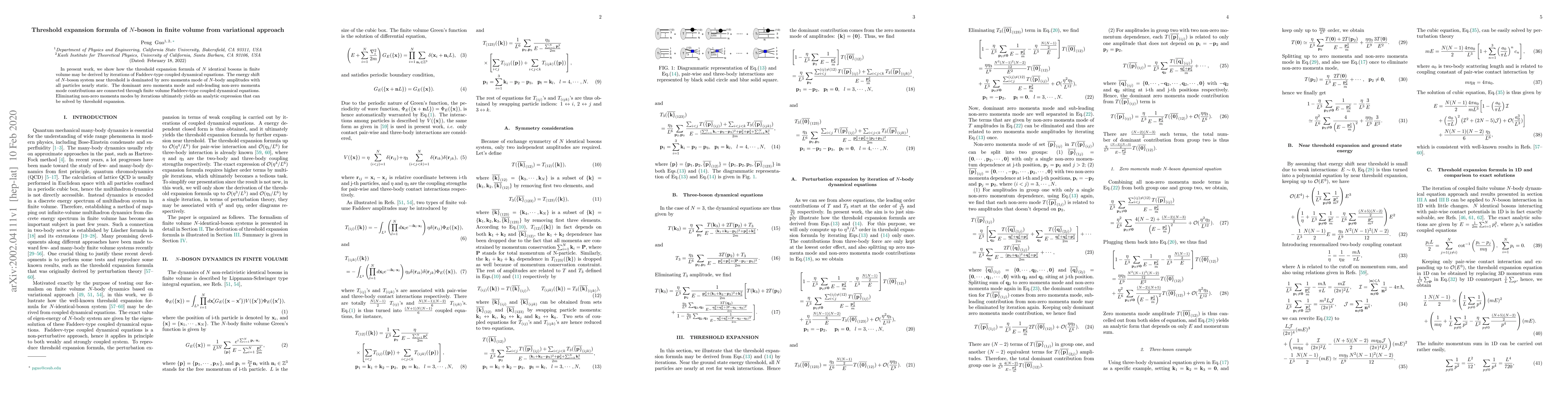 This paper derives the threshold expansion formula for $N$ identical bosons in finite volume using a variational approach based on iterations of Faddeev-type coupled dynamical equations. The energy shift near threshold is primarily influenced by the zero momenta mode, which is connected to sub-leading non-zero momenta modes through finite volume equations, ultimately yielding an analytic expression solvable via threshold expansion.