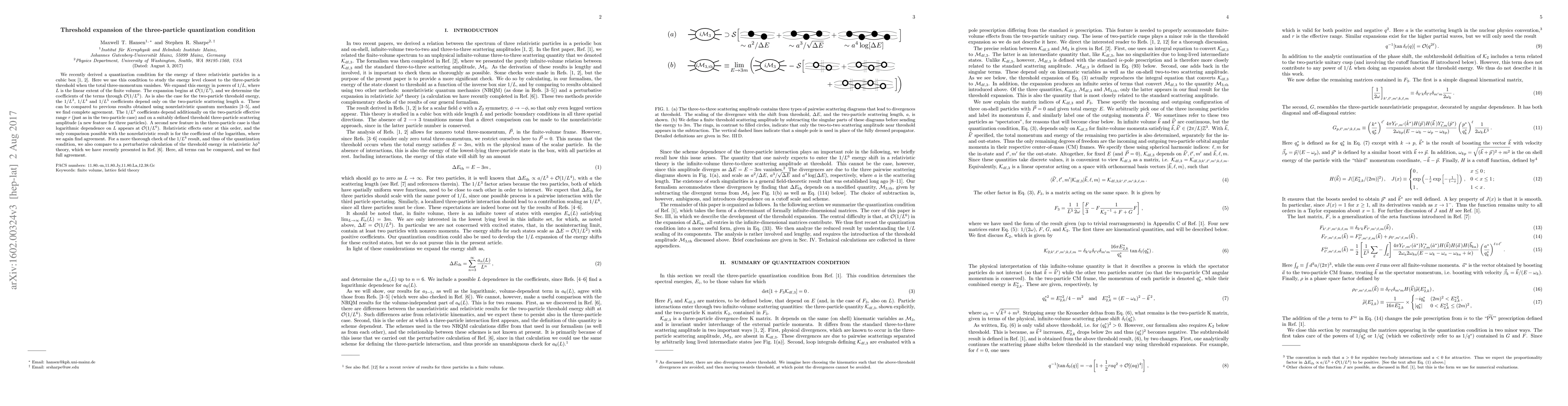 We recently derived a quantization condition for the energy of three relativistic particles in a cubic box. Here we use this condition to study the energy level closest to the three-particle threshold when the total three-momentum vanishes. We expand this energy in powers of $1/L$, where $L$ is the linear extent of the finite volume. The expansion begins at ${\cal O}(1/L^3)$, and we determine the coefficients of the terms through ${\cal O}(1/L^6)$. As is also the case for the two-particle threshold energy, the $1/L^3$, $1/L^4$ and $1/L^5$ coefficients depend only on the two-particle scattering length $a$. These can be compared to previous results obtained using nonrelativistic quantum mechanics and we find complete agreement. The $1/L^6$ coefficients depend additionally on the two-particle effective range $r$ (just as in the two-particle case) and on a suitably defined threshold three-particle scattering amplitude (a new feature for three particles). A second new feature in the three-particle case is that logarithmic dependence on $L$ appears at $\mathcal O(1/L^6)$. Relativistic effects enter at this order, and the only comparison possible with the nonrelativistic result is for the coefficient of the logarithm, where we again find agreement. For a more thorough check of the $1/L^6$ result, and thus of the quantization condition, we also compare to a perturbative calculation of the threshold energy in relativistic $\lambda \phi^4$ theory, which we have recently presented. Here all terms can be compared and we find full agreement.