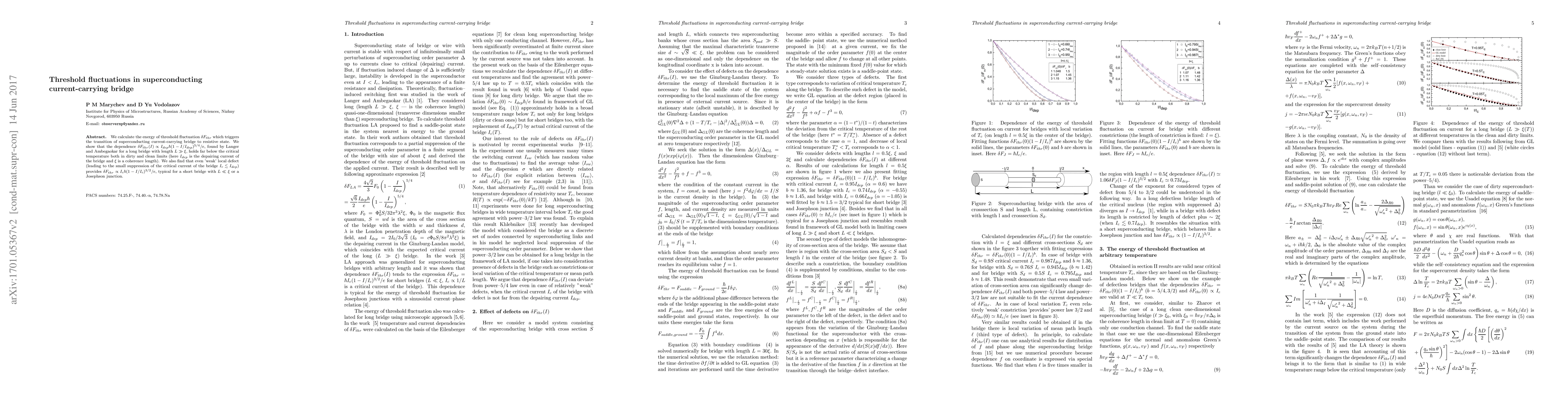 We calculate the energy of threshold fluctuation $\delta F_{thr}$ which triggers the transition of superconducting current-carrying bridge to resistive state. We show that the dependence $\delta F_{thr}(I)\propto I_{dep}\hbar(1-I/I_{dep})^{5/4}/e$, found by Langer and Ambegaokar for a long bridge with length $L \gg \xi$, holds far below the critical temperature both in dirty and clean limits (here $I_{dep}$ is the depairing current of the bridge and $\xi$ is a coherence length). We also find that even 'weak' local defect (leading to the small suppression of the critical current of the bridge $I_c \lesssim I_{dep}$) provides $\delta F_{thr}\propto I_c\hbar(1-I/I_c)^{3/2}/e$, typical for a short bridge with $L \ll \xi$ or a Josephson junction.