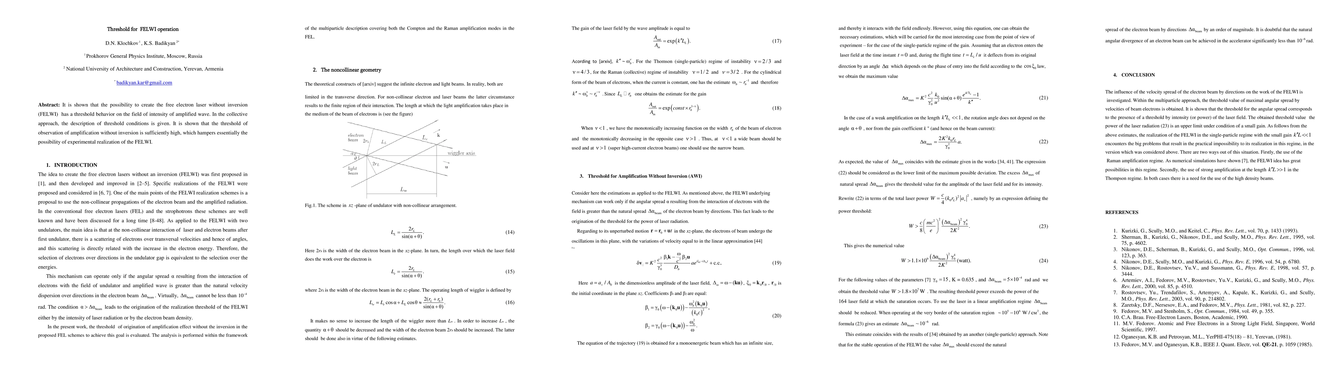 It is shown that the possibility to create the free electron laser without inversion (FELWI) has a threshold behavior on the field of intensity of amplified wave. In the collective approach, the description of threshold conditions is given. It is shown that the threshold of observation of amplification without inversion is sufficiently high, which hampers essentially the possibility of experimental realization of the FELWI.