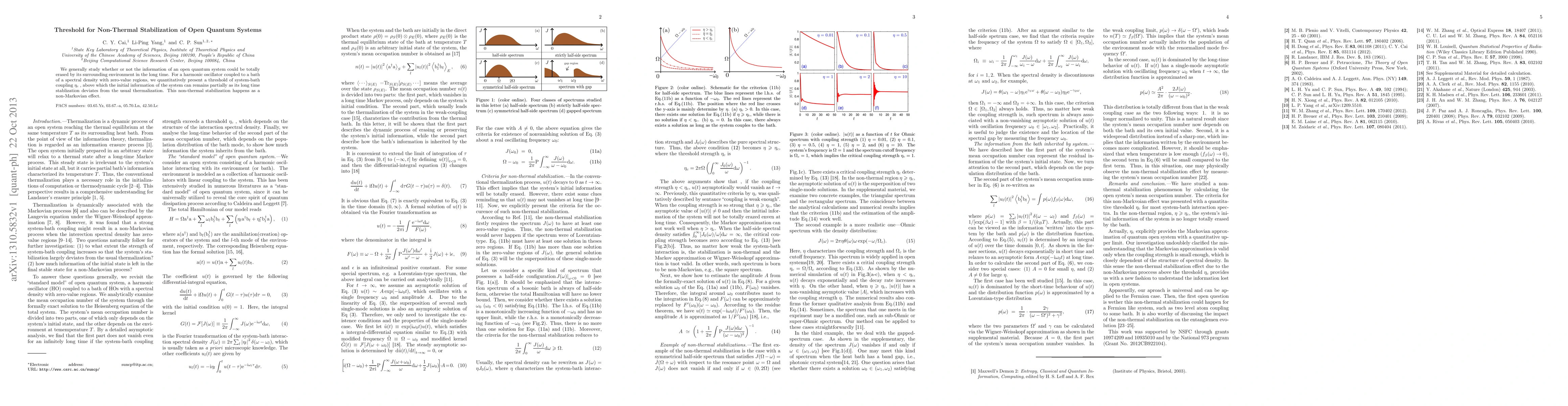 We generally study whether or not the information of an open quantum system could be totally erased by its surrounding environment in the long time. For a harmonic oscillator coupled to a bath of a spectral density with zero-value regions, we quantitatively present a threshold of system-bath coupling \eta_{c}, above which the initial information of the system can remains partially as its long time stablization deviates from the usual thermalization. This non-thermal stabilization happens as a non-Markovian effect.