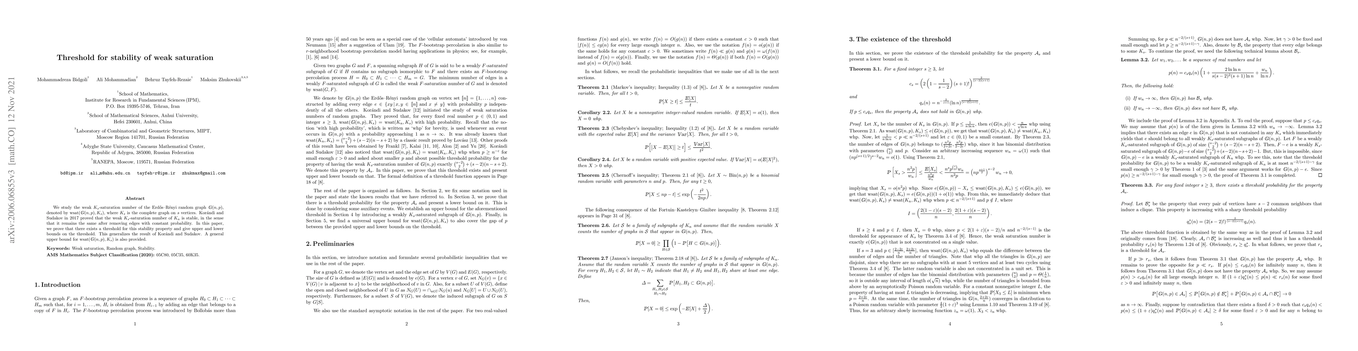 We study the weak $K_s$-saturation number of the Erd\H{o}s--R\'{e}nyi random graph $\mathbbmsl{G}(n, p)$, denoted by $\mathrm{wsat}(\mathbbmsl{G}(n, p), K_s)$, where $K_s$ is the complete graph on $s$ vertices. Kor\'{a}ndi and Sudakov in 2017 proved that the weak $K_s$-saturation number of $K_n$ is stable, in the sense that it remains the same after removing edges with constant probability. In this paper, we prove that there exists a threshold for this stability property and give upper and lower bounds on the threshold. This generalizes the result of Kor\'{a}ndi and Sudakov. A general upper bound for $\mathrm{wsat}(\mathbbmsl{G}(n, p), K_s)$ is also provided.
