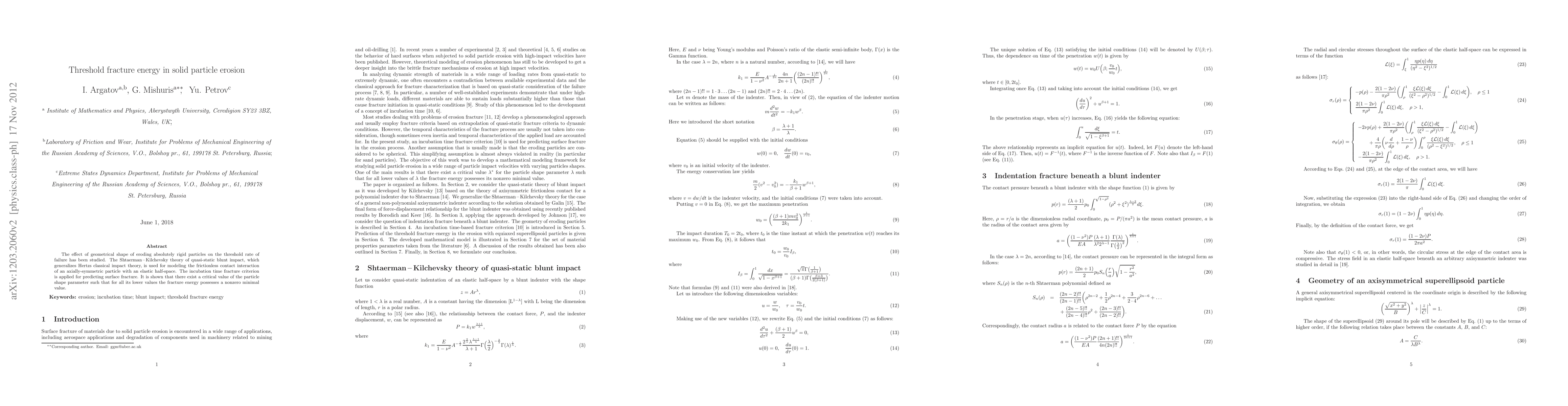 The effect of geometrical shape of eroding absolutely rigid particles on the threshold rate of failure has been studied. The Shtaerman-Kilchevsky theory of quasi-static blunt impact, which generalizes Hertz's classical impact theory, is used for modeling the frictionless contact interaction of an axially-symmetric particle with an elastic half-space. The incubation time fracture criterion is applied for predicting surface fracture. It is shown that there exist a critical value of the particle shape parameter such that for all its lower values the fracture energy possesses a nonzero minimal value.