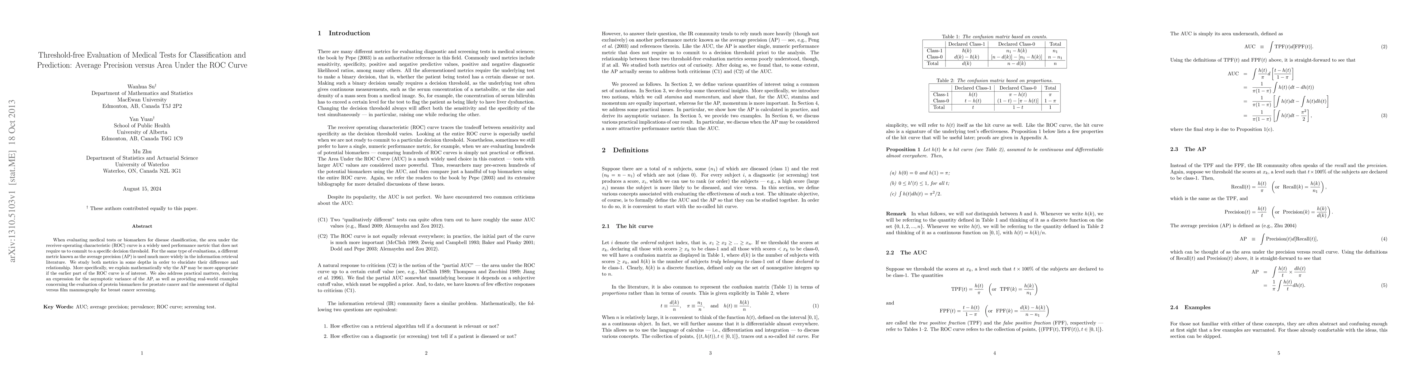 When evaluating medical tests or biomarkers for disease classification, the area under the receiver-operating characteristic (ROC) curve is a widely used performance metric that does not require us to commit to a specific decision threshold. For the same type of evaluations, a different metric known as the average precision (AP) is used much more widely in the information retrieval literature. We study both metrics in some depths in order to elucidate their difference and relationship. More specifically, we explain mathematically why the AP may be more appropriate if the earlier part of the ROC curve is of interest. We also address practical matters, deriving an expression for the asymptotic variance of the AP, as well as providing real-world examples concerning the evaluation of protein biomarkers for prostate cancer and the assessment of digital versus film mammography for breast cancer screening.