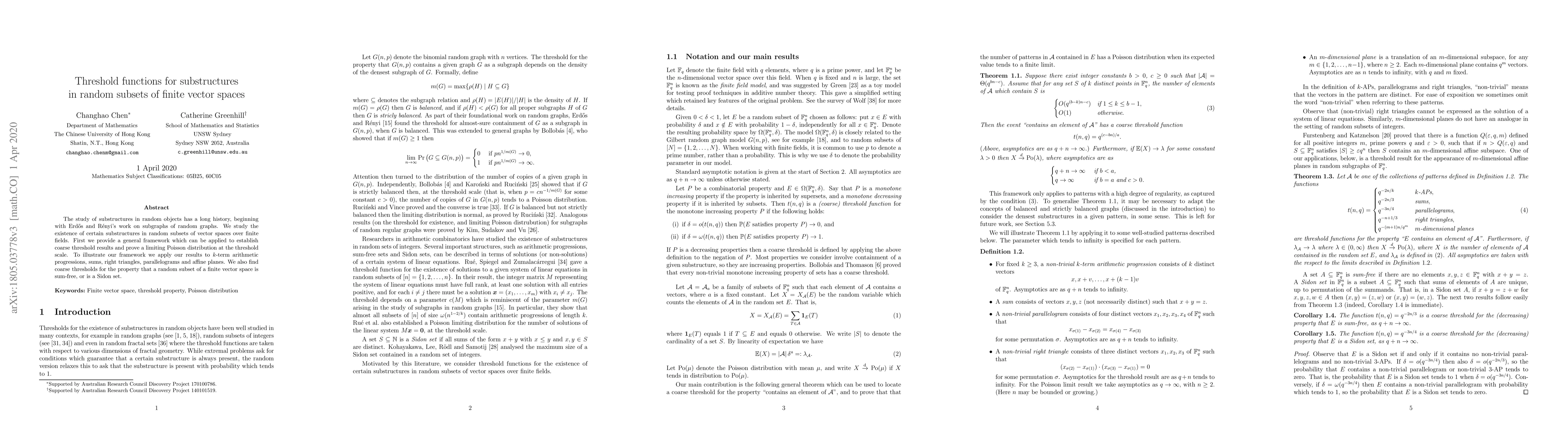 The study of substructures in random objects has a long history, beginning with Erd\H{o}s and R\'enyi's work on subgraphs of random graphs. We study the existence of certain substructures in random subsets of vector spaces over finite fields. First we provide a general framework which can be applied to establish coarse threshold results and prove a limiting Poisson distribution at the threshold scale. To illustrate our framework we apply our results to $k$-term arithmetic progressions, sums, right triangles, parallelograms and affine planes. We also find coarse thresholds for the property that a random subset of a finite vector space is sum-free, or is a Sidon set.