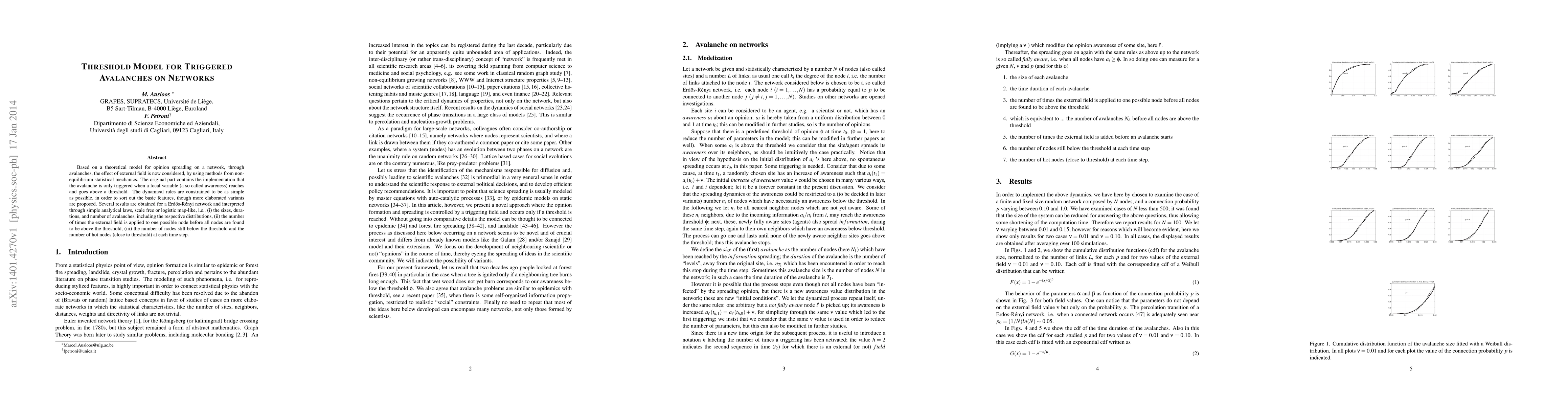 This paper proposes a threshold model for opinion spreading on networks, where avalanches are triggered when a local variable exceeds a threshold. The study uses non-equilibrium statistical mechanics to analyze the dynamics, focusing on the sizes, durations, and distributions of avalanches, and the number of nodes below and above the threshold over time.