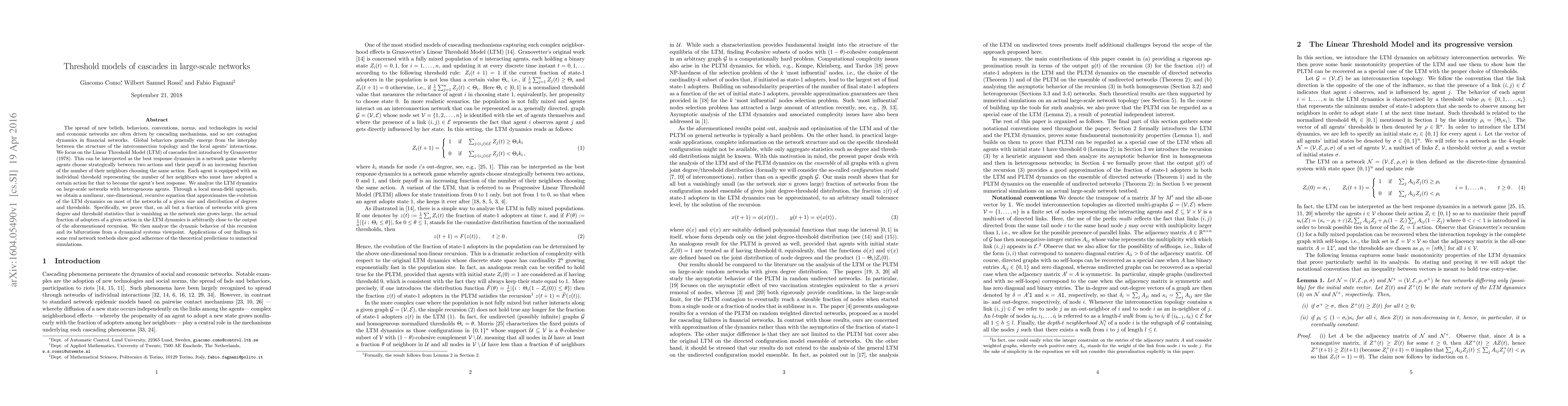 The spread of new beliefs, behaviors, conventions, norms, and technologies in social and economic networks are often driven by cascading mechanisms, and so are contagion dynamics in financial networks. Global behaviors generally emerge from the interplay between the structure of the interconnection topology and the local agents' interactions. We focus on the Linear Threshold Model (LTM) of cascades first introduced by Granovetter (1978). This can be interpreted as the best response dynamics in a network game whereby agents choose strategically between two actions and their payoff is an increasing function of the number of their neighbors choosing the same action. Each agent is equipped with an individual threshold representing the number of her neighbors who must have adopted a certain action for that to become the agent's best response. We analyze the LTM dynamics on large-scale networks with heterogeneous agents. Through a local mean-field approach, we obtain a nonlinear, one-dimensional, recursive equation that approximates the evolution of the LTM dynamics on most of the networks of a given size and distribution of degrees and thresholds. Specifically, we prove that, on all but a fraction of networks with given degree and threshold statistics that is vanishing as the network size grows large, the actual fraction of adopters of a given action in the LTM dynamics is arbitrarily close to the output of the aforementioned recursion. We then analyze the dynamic behavior of this recursion and its bifurcations from a dynamical systems viewpoint. Applications of our findings to some real network testbeds show good adherence of the theoretical predictions to numerical simulations.