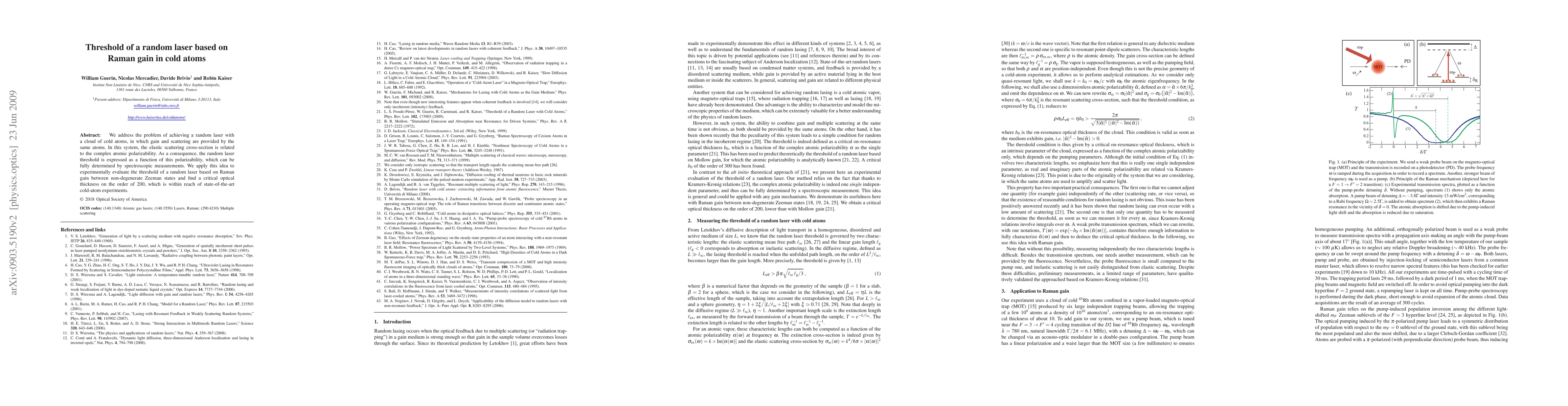 We address the problem of achieving a random laser with a cloud of cold atoms, in which gain and scattering are provided by the same atoms. In this system, the elastic scattering cross-section is related to the complex atomic polarizability. As a consequence, the random laser threshold is expressed as a function of this polarizability, which can be fully determined by spectroscopic measurements. We apply this idea to experimentally evaluate the threshold of a random laser based on Raman gain between non-degenerate Zeeman states and find a critical optical thickness on the order of 200, which is within reach of state-of-the-art cold-atom experiments.