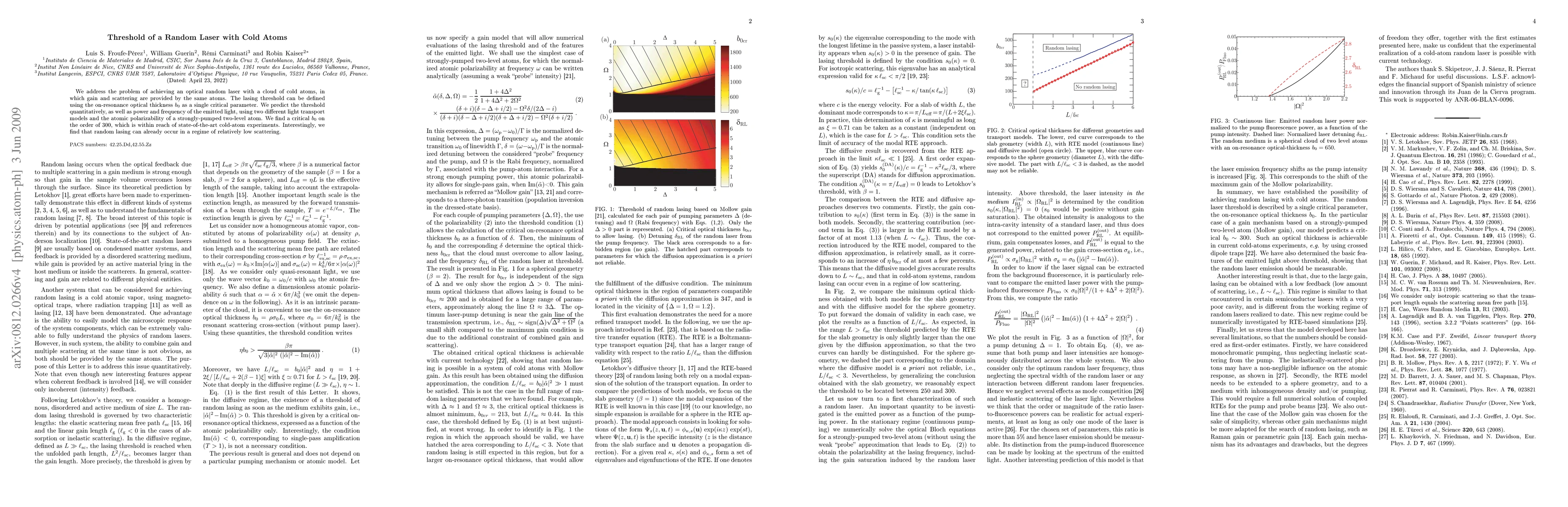 This paper investigates the threshold for a random laser utilizing a cloud of cold atoms, where gain and scattering are provided by the same atoms. The authors predict the lasing threshold quantitatively using two light transport models and find a critical optical thickness b0 of around 300, achievable with current cold-atom experiments.