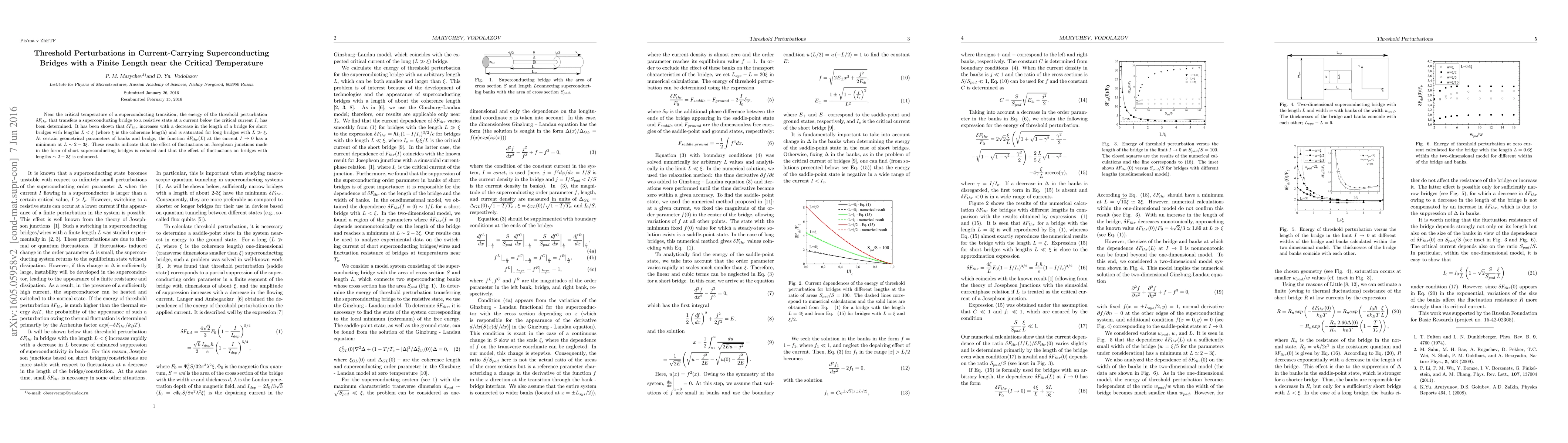 This paper investigates how threshold perturbations affect current-carrying superconducting bridges near the critical temperature. It finds that the perturbation energy increases with decreasing bridge length for short bridges and saturates for long ones, with a minimum at lengths around $2-3 \xi$, indicating reduced fluctuation effects for short bridges and enhanced effects for bridges of this length.