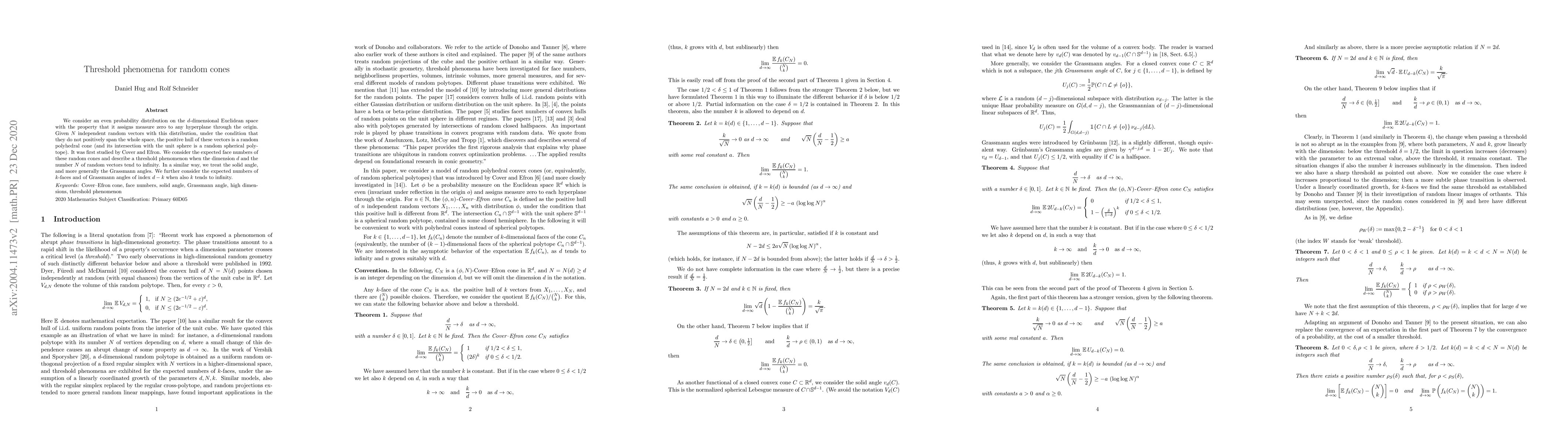 The paper establishes a threshold phenomenon for expected face numbers and Grassmann angles of random cones, linking geometric properties to asymptotic behavior in high dimensions.