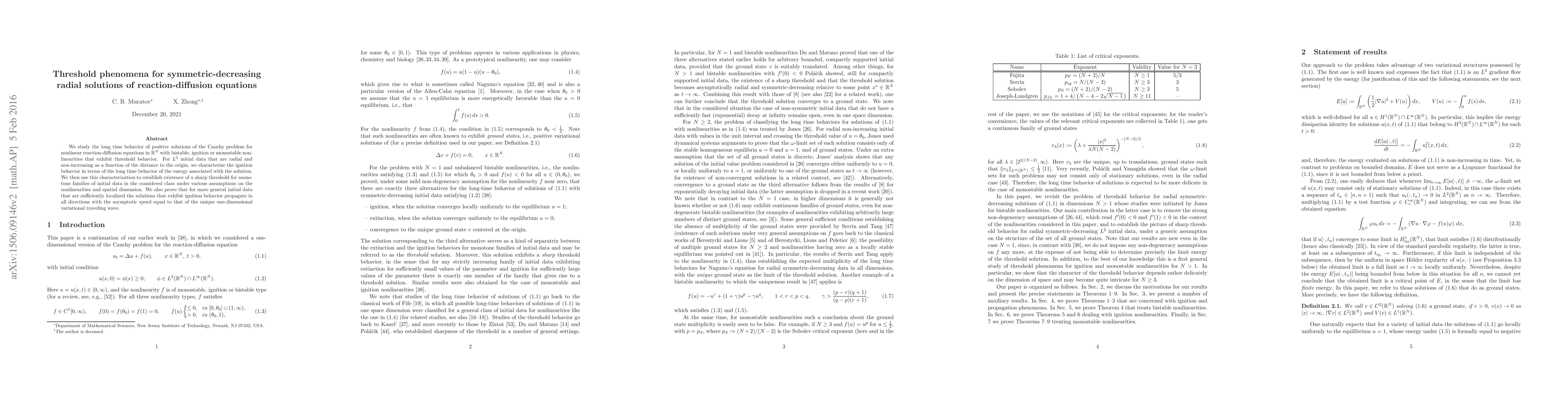 This paper investigates the long-term behavior of radial, symmetric-decreasing solutions to reaction-diffusion equations, establishing a threshold phenomenon for ignition behavior. It characterizes the long-time behavior through the solution's energy and proves the existence of a sharp threshold for monotone initial data families.