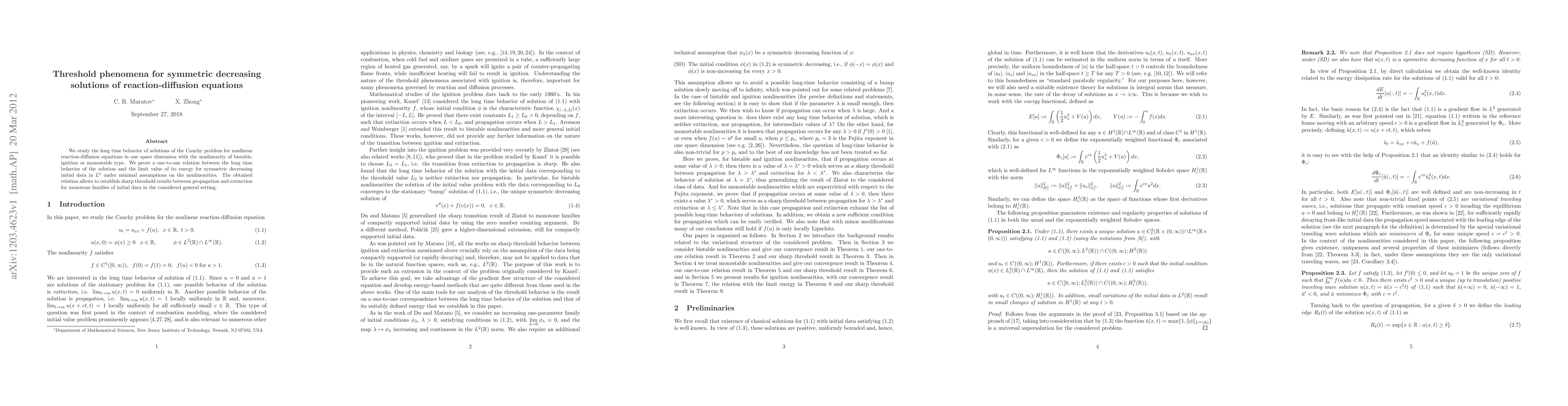 This paper investigates the long-term behavior of solutions to reaction-diffusion equations with bistable, ignition, or monostable nonlinearities, establishing a one-to-one correspondence between the solution's behavior and its energy limit for symmetric decreasing initial data. It also identifies sharp threshold conditions for propagation versus extinction based on this relationship.