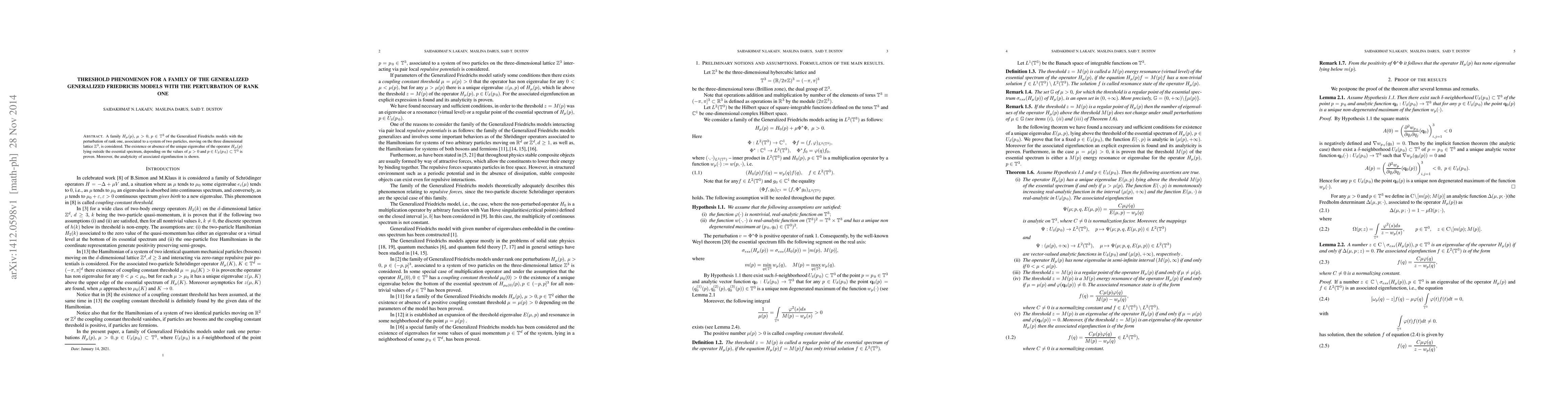 A family $H_\mu(p),$ $\mu>0,$ $p\in\T^3$ of the Generalized Firedrichs models with the perturbation of rank one, associated to a system of two particles, moving on the three dimensional lattice $\mathbb{\Z}^3,$ is considered. The existence or absence of the unique eigenvalue of the operator $H_\mu(p)$ lying outside the essential spectrum, depending on the values of $\mu>0$ and $p\in U_{\delta}(p_{\,0})\subset\T^3$ is proven. Moreover, the analyticity of associated eigenfunction is shown.