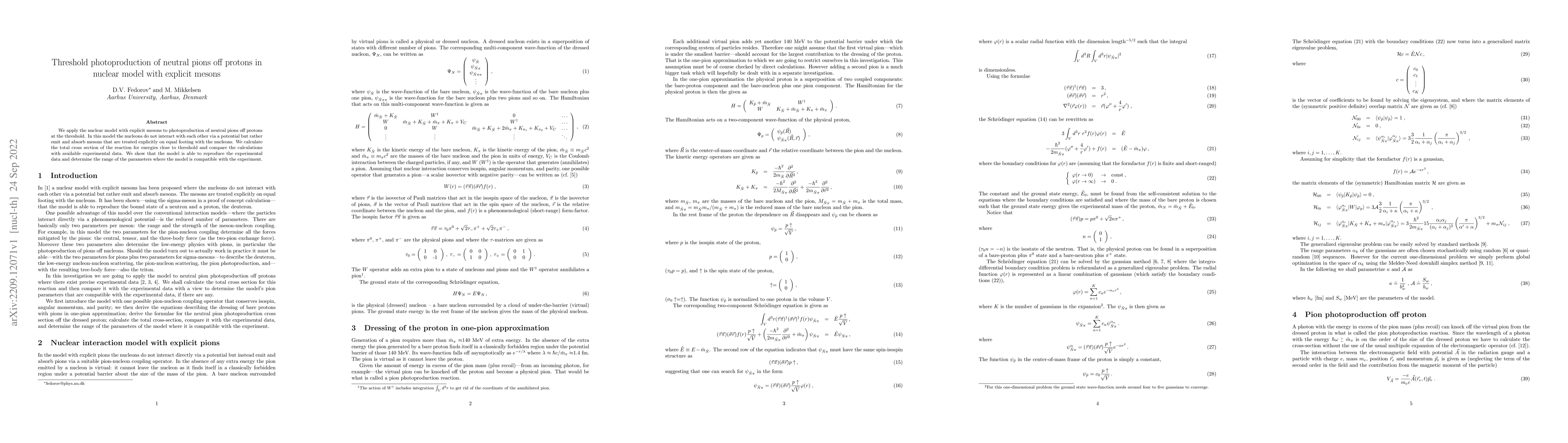 This research applies a nuclear model with explicit mesons to study neutral pion photoproduction off protons near threshold, showing the model's ability to reproduce experimental data and determining its parameter compatibility.
