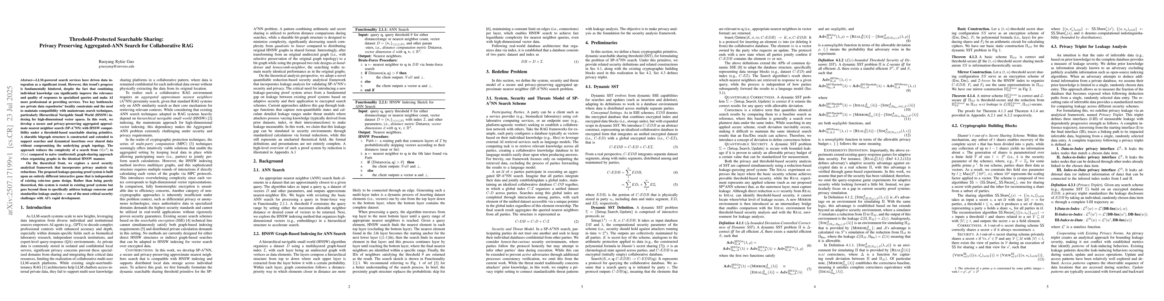LLM-powered search services have driven data integration as a significant trend. However, this trend's progress is fundamentally hindered, despite the fact that combining individual knowledge can significantly improve the relevance and quality of responses in specialized queries and make AI more professional at providing services. Two key bottlenecks are private data repositories' locality constraints and the need to maintain compatibility with mainstream search techniques, particularly Hierarchical Navigable Small World (HNSW) indexing for high-dimensional vector spaces. In this work, we develop a secure and privacy-preserving aggregated approximate nearest neighbor search (SP-A$^2$NN) with HNSW compatibility under a threshold-based searchable sharing primitive. A sharable bitgraph structure is constructed and extended to support searches and dynamical insertions over shared data without compromising the underlying graph topology. The approach reduces the complexity of a search from $O(n^2)$ to $O(n)$ compared to naive (undirected) graph-sharing approach when organizing graphs in the identical HNSW manner. On the theoretical front, we explore a novel security analytical framework that incorporates privacy analysis via reductions. The proposed leakage-guessing proof system is built upon an entirely different interactive game that is independent of existing coin-toss game design. Rather than being purely theoretical, this system is rooted in existing proof systems but goes beyond them to specifically address leakage concerns and standardize leakage analysis -- one of the most critical security challenges with AI's rapid development.