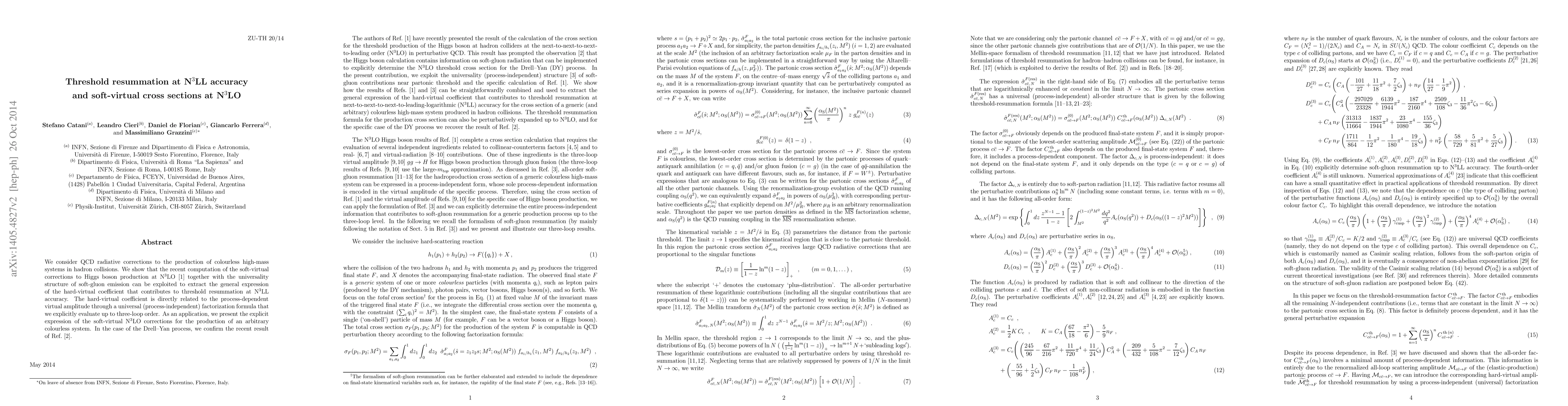 This paper presents QCD radiative corrections for the production of high-mass colourless systems, achieving N$^3$LL resummation accuracy and N$^3$LO soft-virtual cross sections. The study leverages recent N$^3$LO computations and universality to derive the hard-virtual coefficient for threshold resummation, confirming results for the Drell-Yan process.
