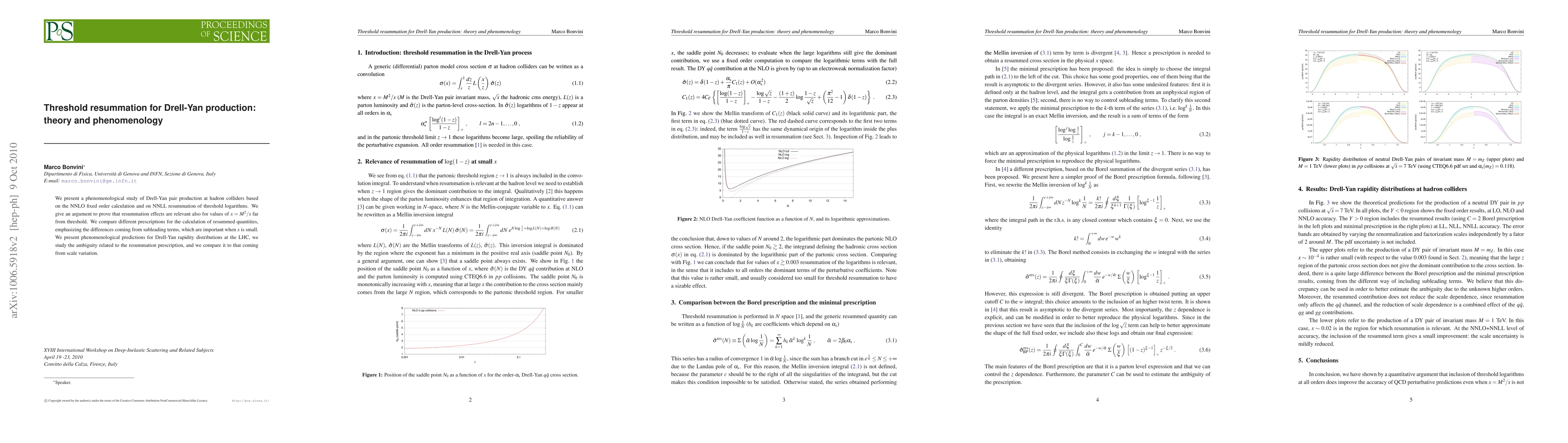 This paper studies Drell-Yan pair production at hadron colliders using NNLO fixed-order calculations and NNLL threshold resummation, demonstrating the relevance of resummation effects even for non-threshold values of x. It compares different resummation prescriptions and assesses their impact on predictions for Drell-Yan rapidity distributions at the LHC.