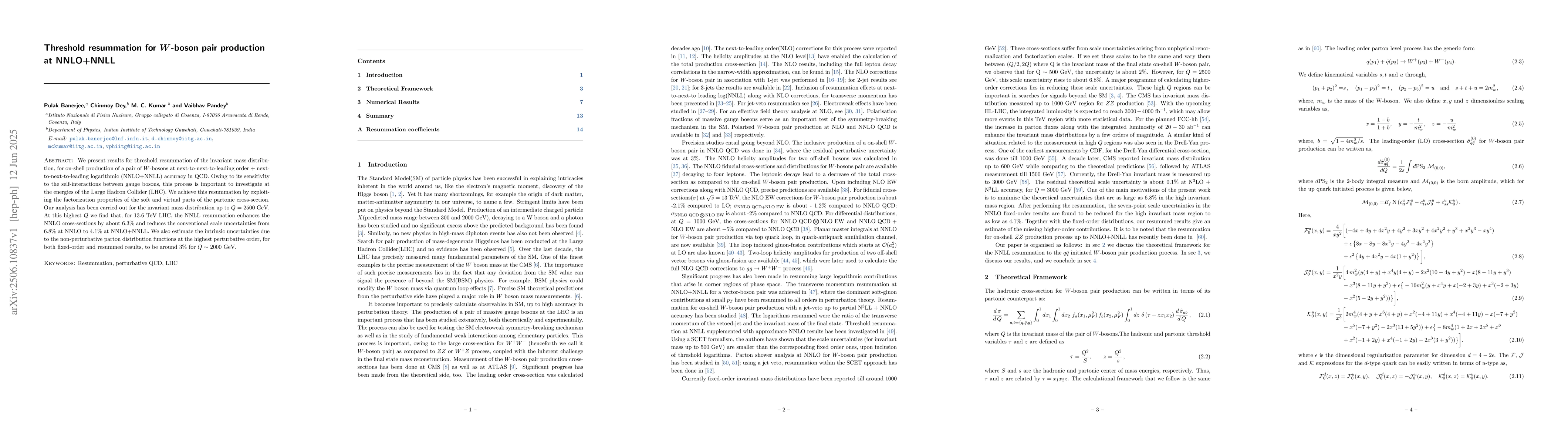 Researchers present threshold resummation for W-boson pair production at next-to-next-to-leading order + next-to-next-to-leading logarithmic accuracy, finding a 6.3% enhancement of NNLO cross-sections at the LHC.