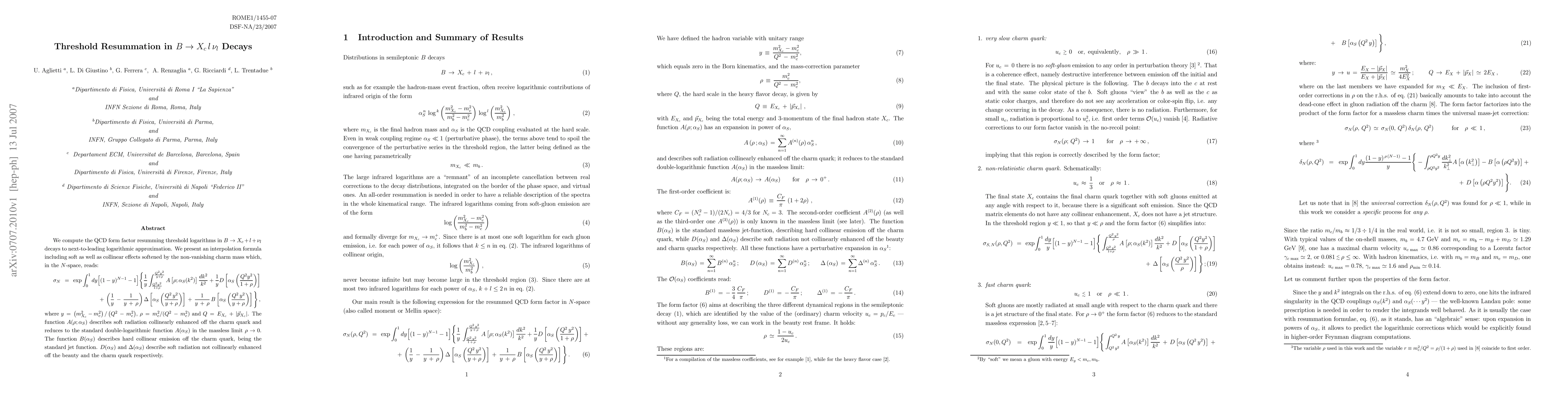 We compute the QCD form factor resumming threshold logarithms in B --> X_c + l + nu_l decays to next-to-leading logarithmic approximation. We present an interpolation formula including soft as well as collinear effects softened by the non-vanishing charm mass.