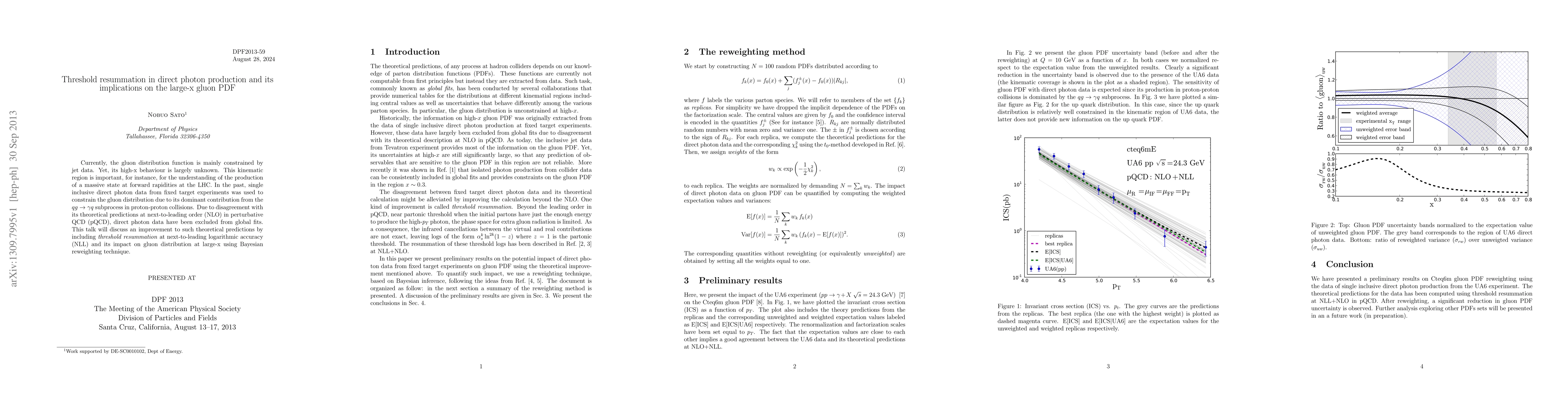 This paper discusses the improvement of theoretical predictions for direct photon production by incorporating threshold resummation at next-to-leading logarithmic accuracy, aiming to better constrain the high-x gluon distribution function, which is crucial for understanding phenomena at the LHC. The method uses Bayesian reweighting to reassess the impact of direct photon data on gluon distribution.