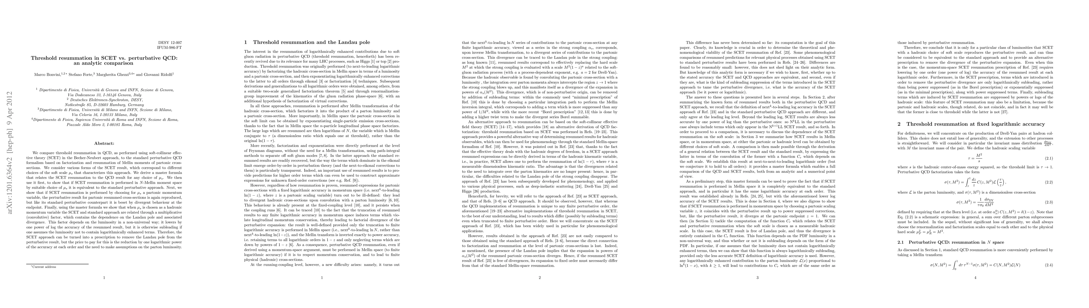 We compare threshold resummation in QCD, as performed using soft-collinear effective theory (SCET), to the standard perturbative QCD formalism based on factorization and resummation of Mellin moments of partonic cross-sections. We consider various forms of the SCET result, which correspond to different choices of the soft scale mu_s that characterizes this approach. We derive a master formula that relates the SCET resummation to the QCD result for any choice of mu_s. We then use it first, to show that if SCET resummation is performed in N-Mellin moment space by suitable choice of mu_s it is equivalent to the standard perturbative approach. Next, we show that if SCET resummation is performed by choosing for mu_s a partonic momentum variable, the perturbative result for partonic resummed cross-sections is again reproduced, but like its standard perturbative counterpart it is beset by divergent behaviour at the endpoint. Finally, using the master formula we show that when mu_s is chosen as a hadronic momentum variable the SCET and standard approach are related through a multiplicative (convolutive) factor, which contains the dependence on the Landau pole and associated divergence. This factor depends on the luminosity in a non-universal way; it lowers by one power of log the accuracy of the resummed result, but it is otherwise subleading if one assumes the luminosity not to contain logarithmically enhanced terms. Therefore, the SCET approach can be turned into a prescription to remove the Landau pole from the perturbative result, but the price to pay for this is the reduction by one logarithmic power of the accuracy at each order and the need to make assumptions on the parton luminosity.