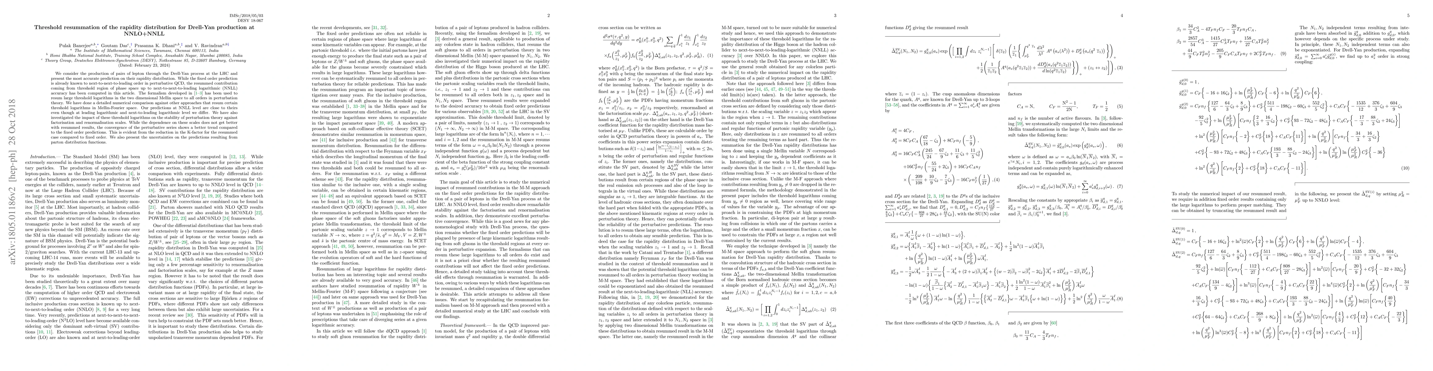 We consider the production of pairs of lepton through the Drell-Yan process at the LHC and present the most accurate prediction on their rapidity distribution. While the fixed order prediction is already known to next-to-next-to-leading order in perturbative QCD, the resummed contribution coming from threshold region of phase space up to next-to-next-to-leading logarithmic (NNLL) accuracy has been computed in this article. The formalism developed in [1-3] has been used to resum large threshold logarithms in the two dimensional Mellin space to all orders in perturbation theory. We have done a detailed numerical comparison against other approaches that resum certain threshold logarithms in Mellin-Fourier space. Our predictions at NNLL level are close to theirs even though at leading logarithmic and next-to-leading logarithmic level we differ. We have also investigated the impact of these threshold logarithms on the stability of perturbation theory against factorisation and renormalisation scales. While the dependence on these scales does not get better with resummed results, the convergence of the perturbative series shows a better trend compared to the fixed order predictions. This is evident from the reduction in the K-factor for the resummed case compared to fixed order. We also present the uncertainties on the predictions resulting from parton distribution functions.